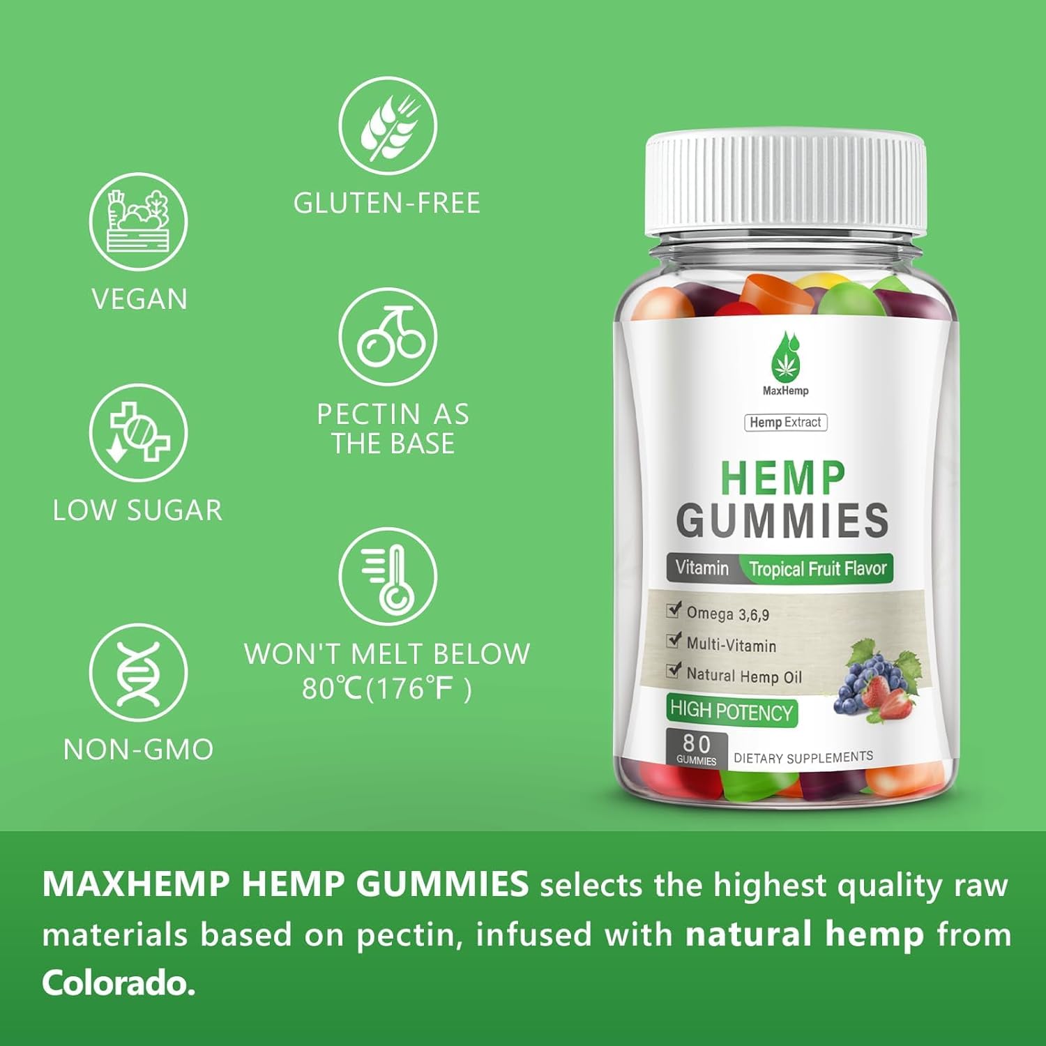 MaxHemp always uses only raw materials from the world’s most famous origins, gelatin-free, no additives, not easy to melt, non-GMO, vegan-friendly, tropical fruits flavor,enjoy it!