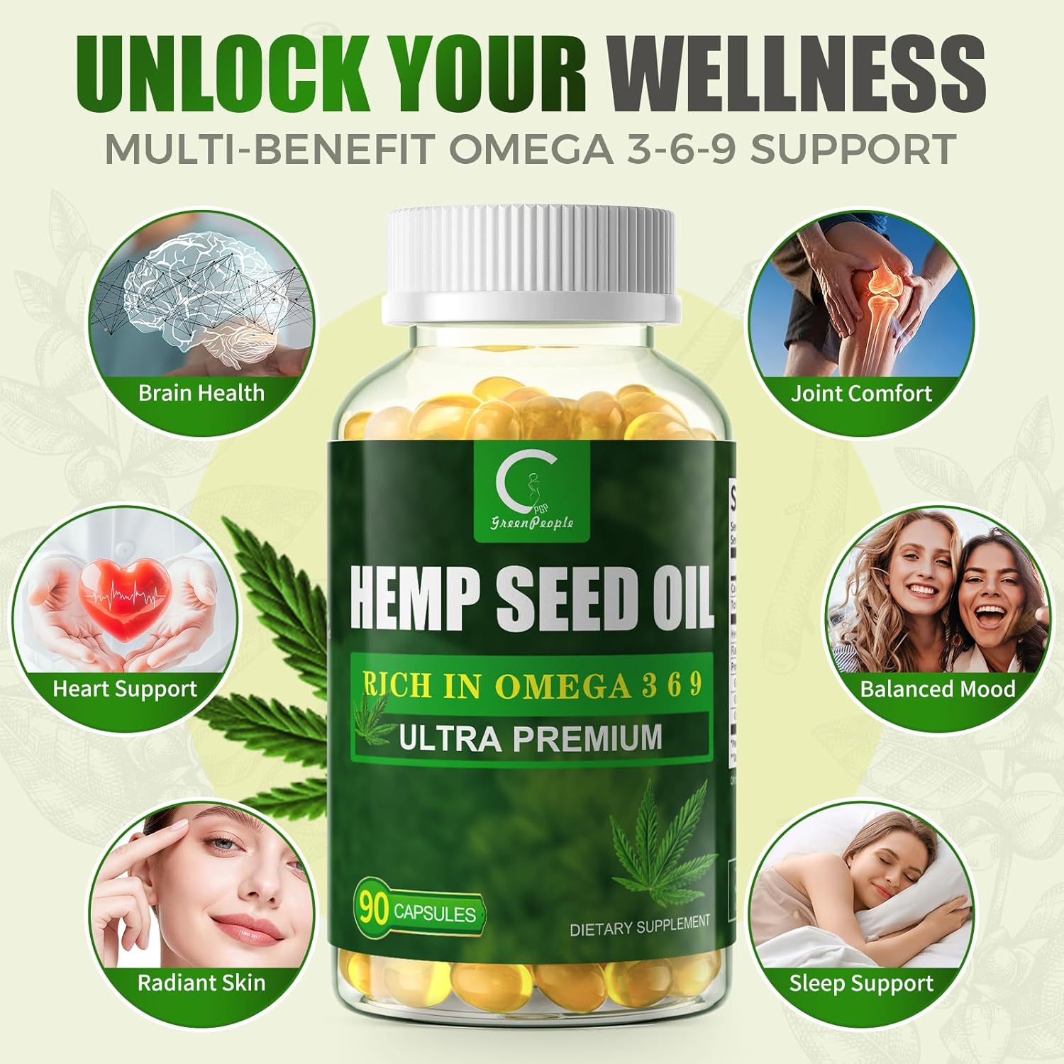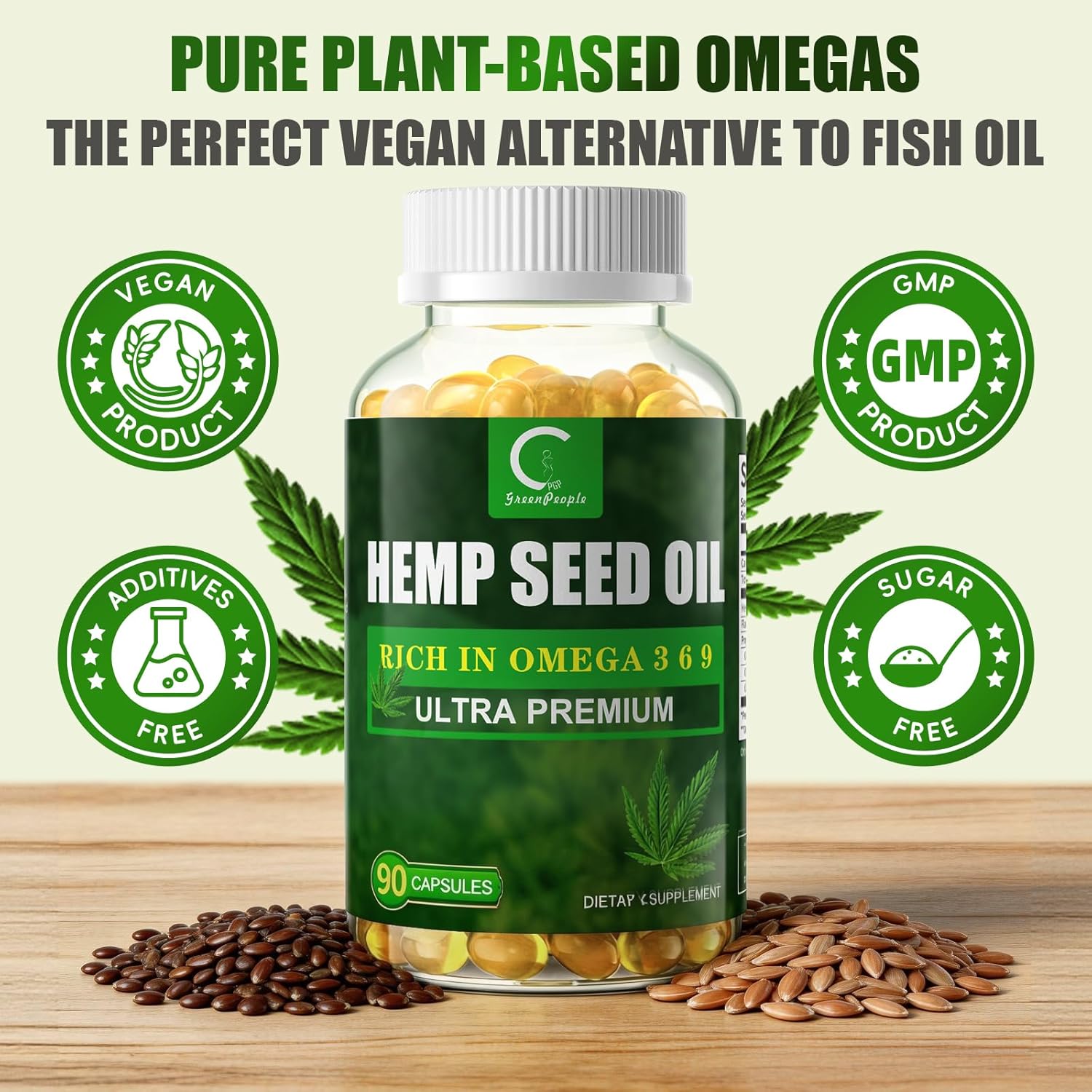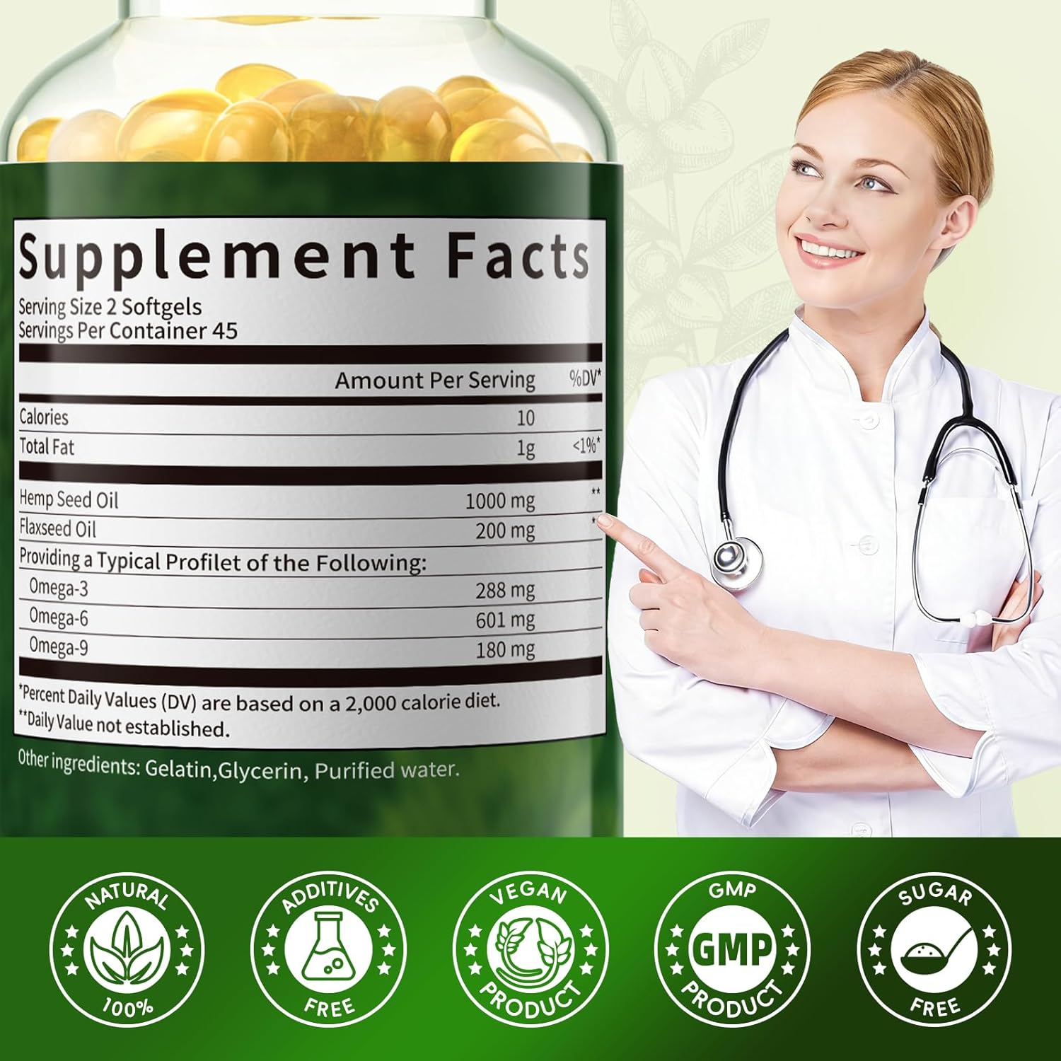 ULTIMATE OMEGA 3-6-9 SYNERGY: Our premium formula combines 1000mg of Cold-Pressed Hemp Seed Oil with 200mg of Flaxseed Oil to provide a perfectly balanced profile of essential fatty acids. This plant-based powerhouse delivers 288mg Omega-3, 601mg Omega-6, and 180mg Omega-9 per serving, offering a superior vegan alternative to traditional fish oil without the fishy aftertaste.