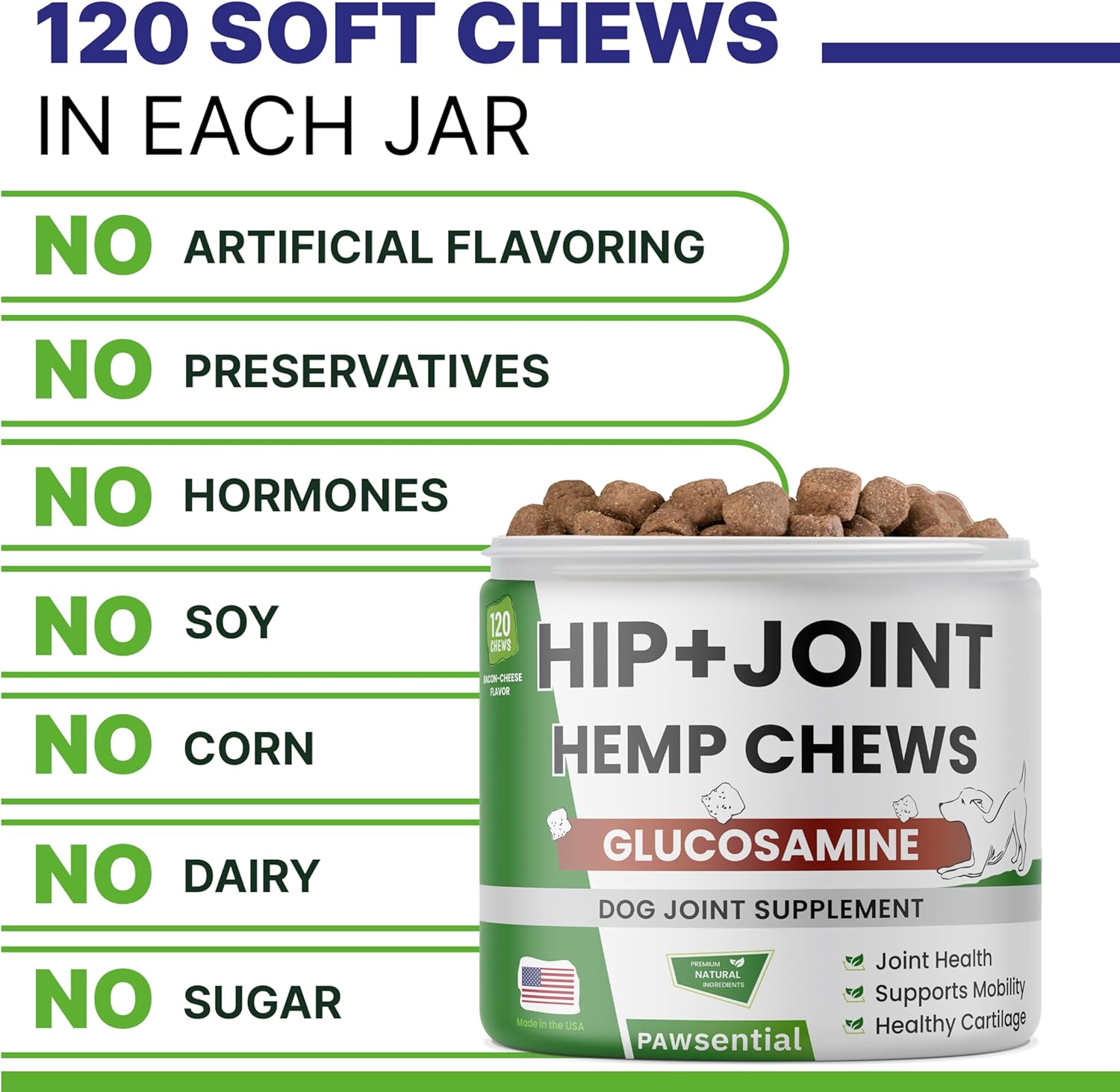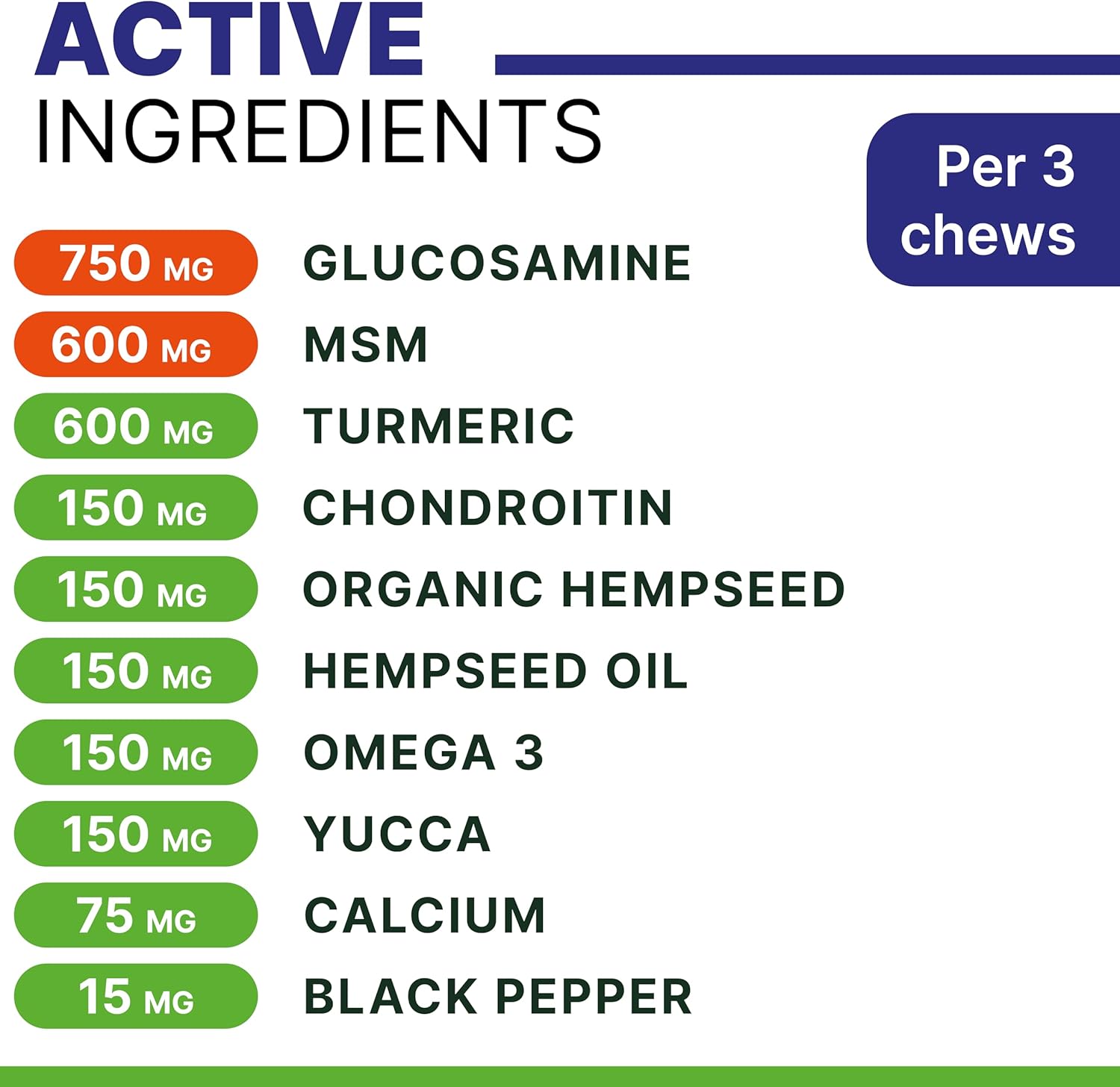 Hemp Chews for Dogs Hip and Joint Pain Relief β Our advanced hemp joint supplement for dogs with glucosamine chondroitin aid joint health and ease arthritis pain. Plus, our soft chews have hemp oil and MSM for anti-inflammatory benefits.