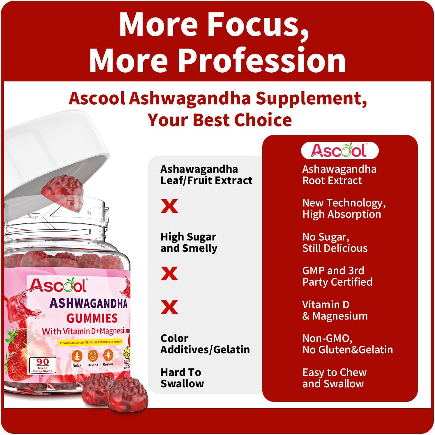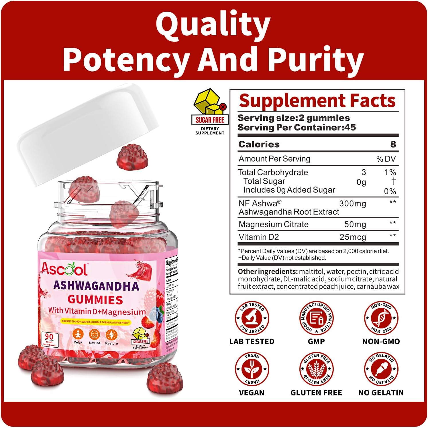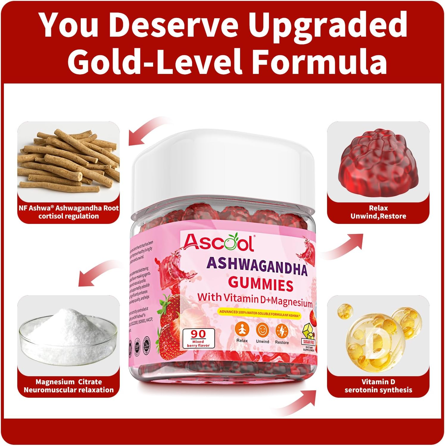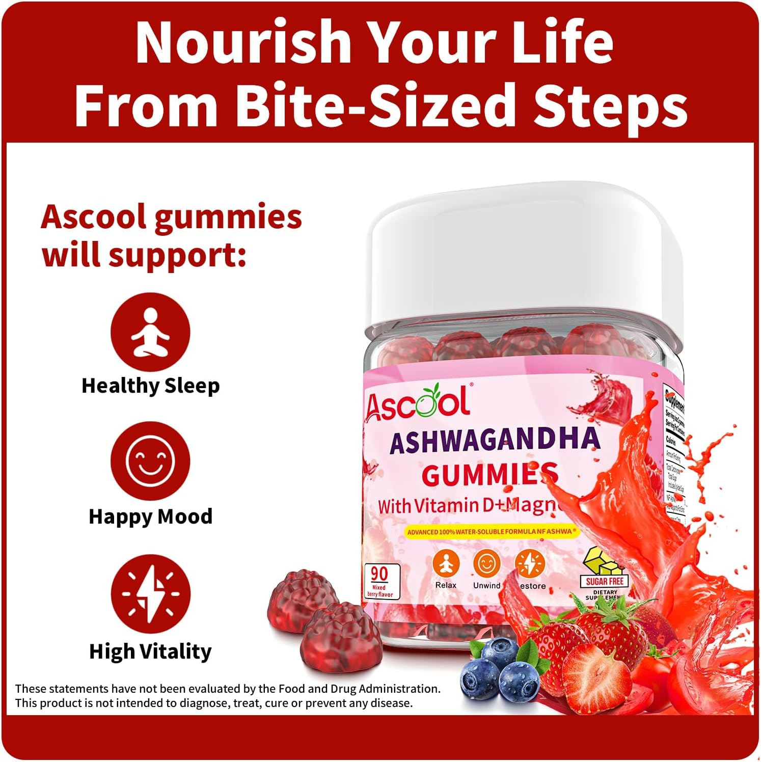 Great Taste & Simple Daily Routine: 90 mixed berry gummies made with real ashwa root extract. Just 2 gummies daily—no pills, no powders.