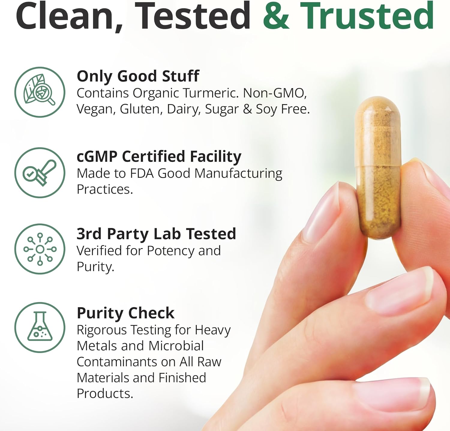 Tumeric Curcumin supplements are crafted with the highest standards of quality & transparency. Made in the USA with globally-sourced ingredients, each batch is third-party tested for purity & potency, following strict cGMP guidelines to deliver a Turmeric Curcumin supplement you can trust.*