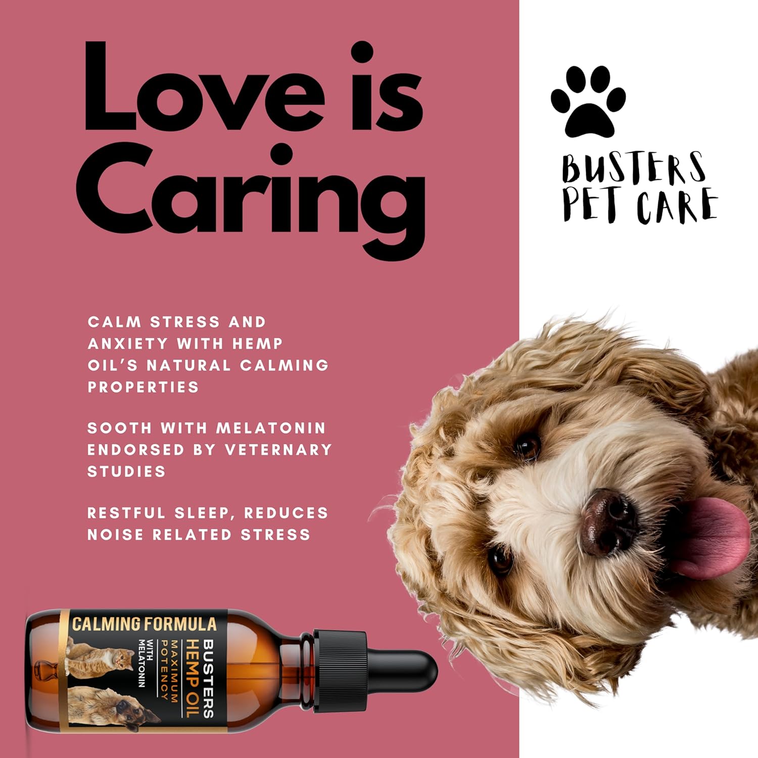 Busters Calming Hemp Oil, Enriched with Melatonin for Dogs, Cats, Pets, Sleep, WEL Being and an Ideal Omega Ratio, Adrenal and Cushings Support