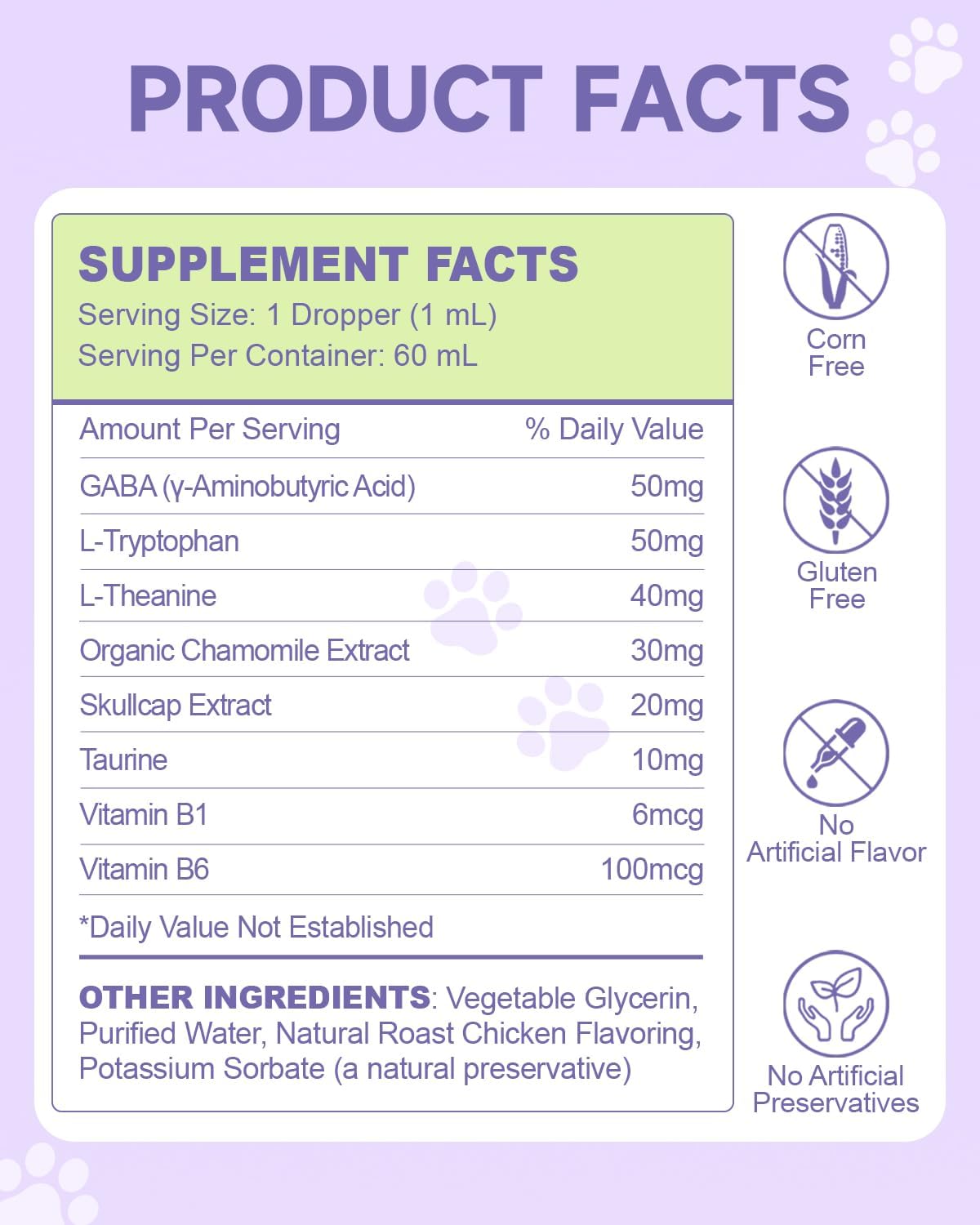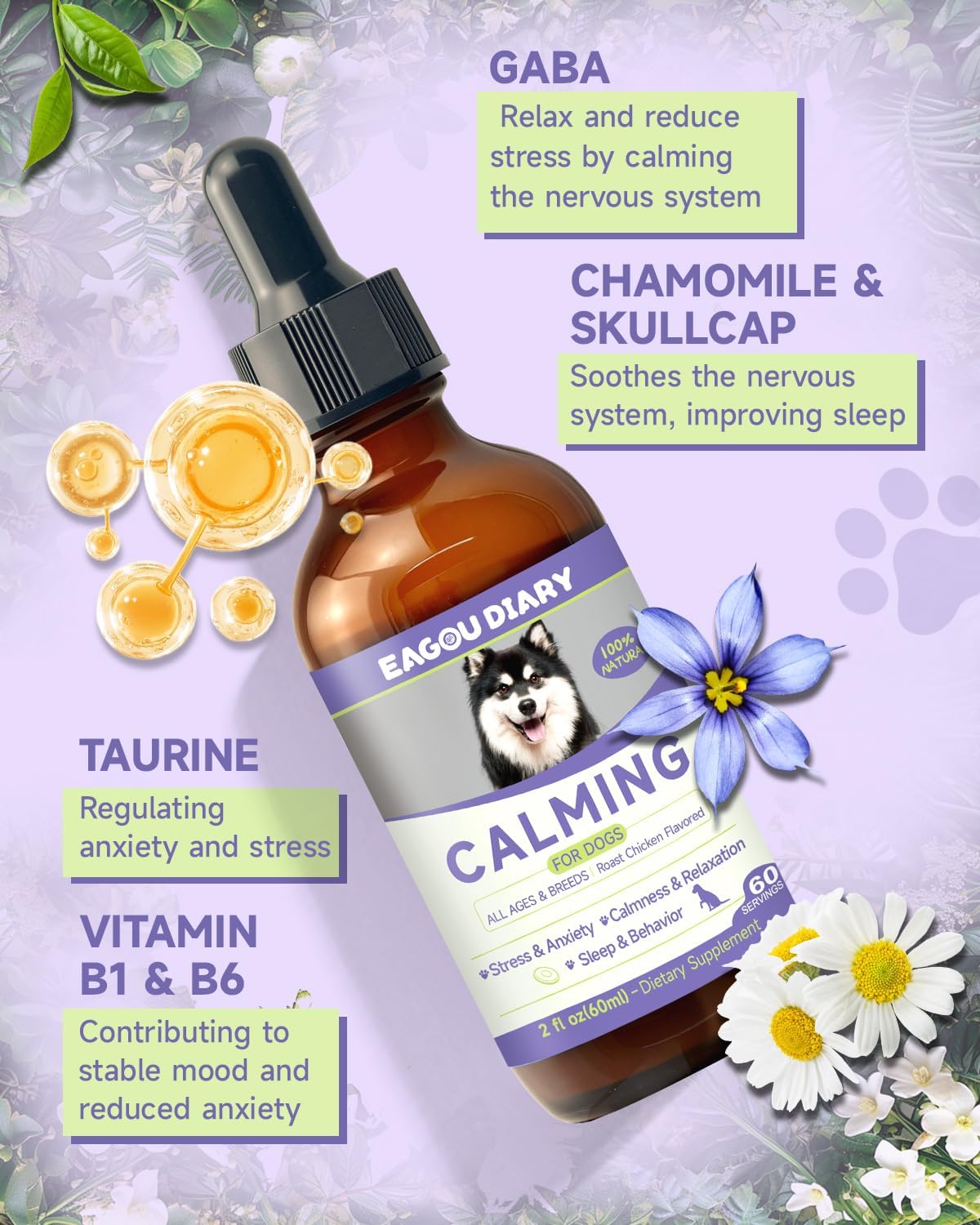 Multi-Ingredient Formula: The calming care for dogs contains GABA (γ-Aminobutyric Acid), L-Tryptophan, L-Theanine, Organic Chamomile Extract, Skullcap Extract, Taurine, Vitamin B1, and Vitamin B6. These dog anxiety drop ingredients work synergistically to support your dog’s nervous system and promote a calm demeanor