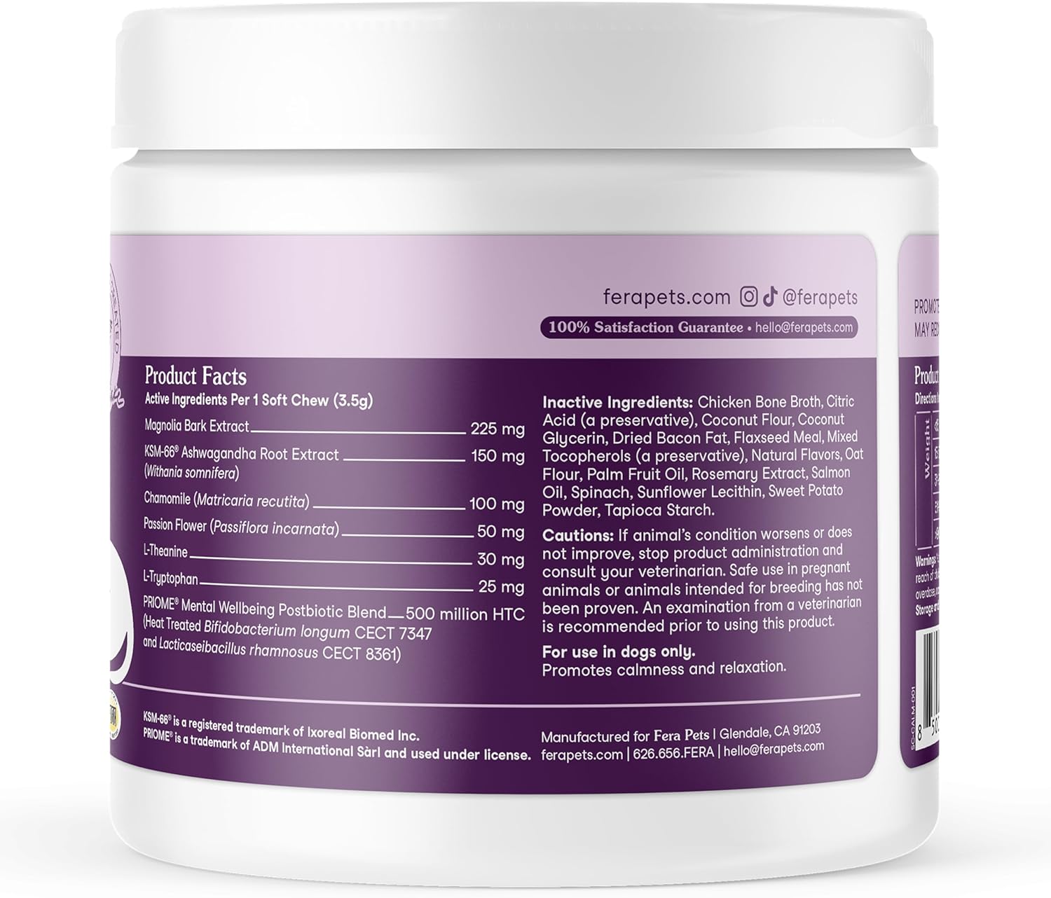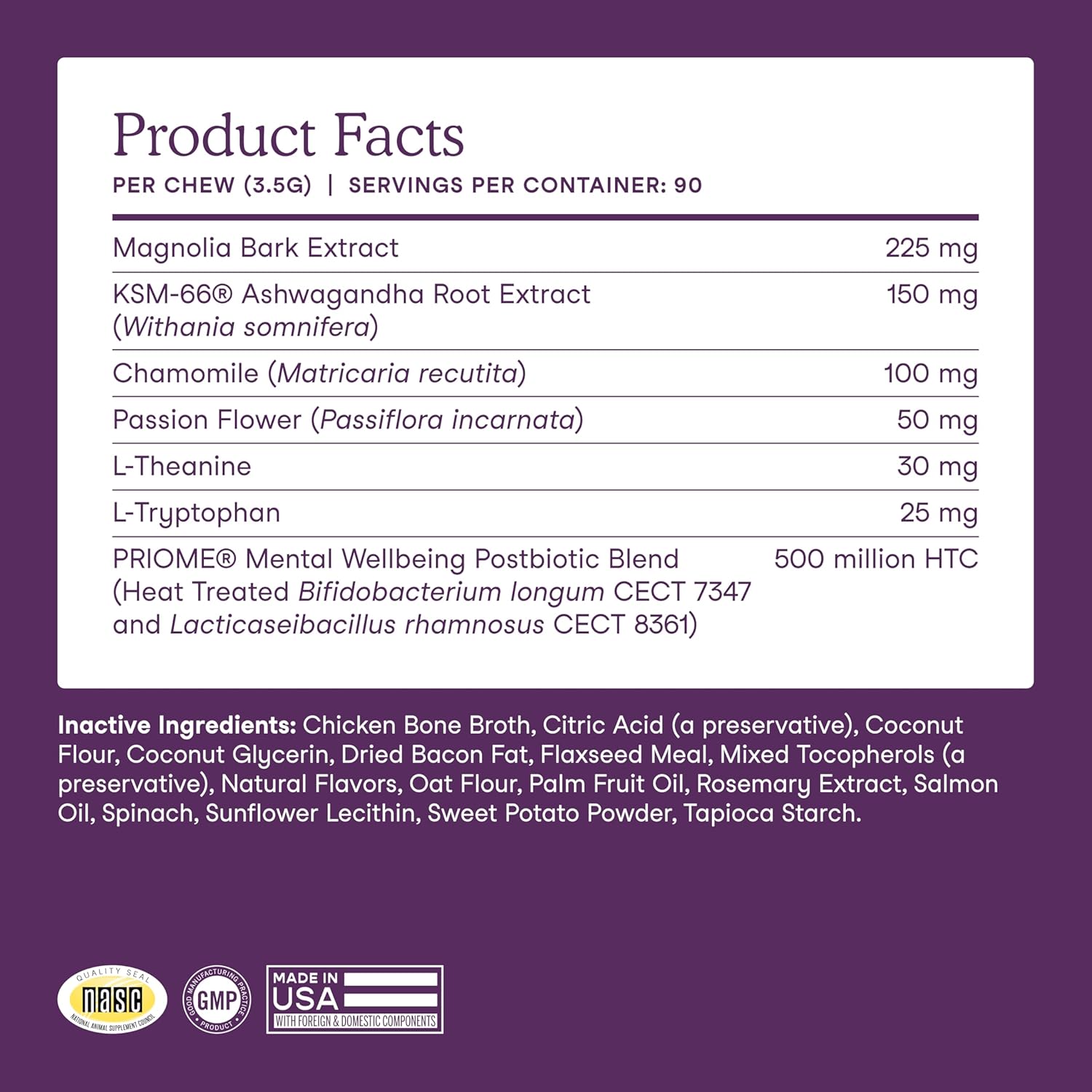 Premium Traceable Ingredients That Go Beyond the Basics: Our dog calming chews are made with KSM-66 ashwagandha, magnolia bark, chamomile, passionflower, L-theanine, and L-tryptophan; no artificial preservatives, fillers, or dyes