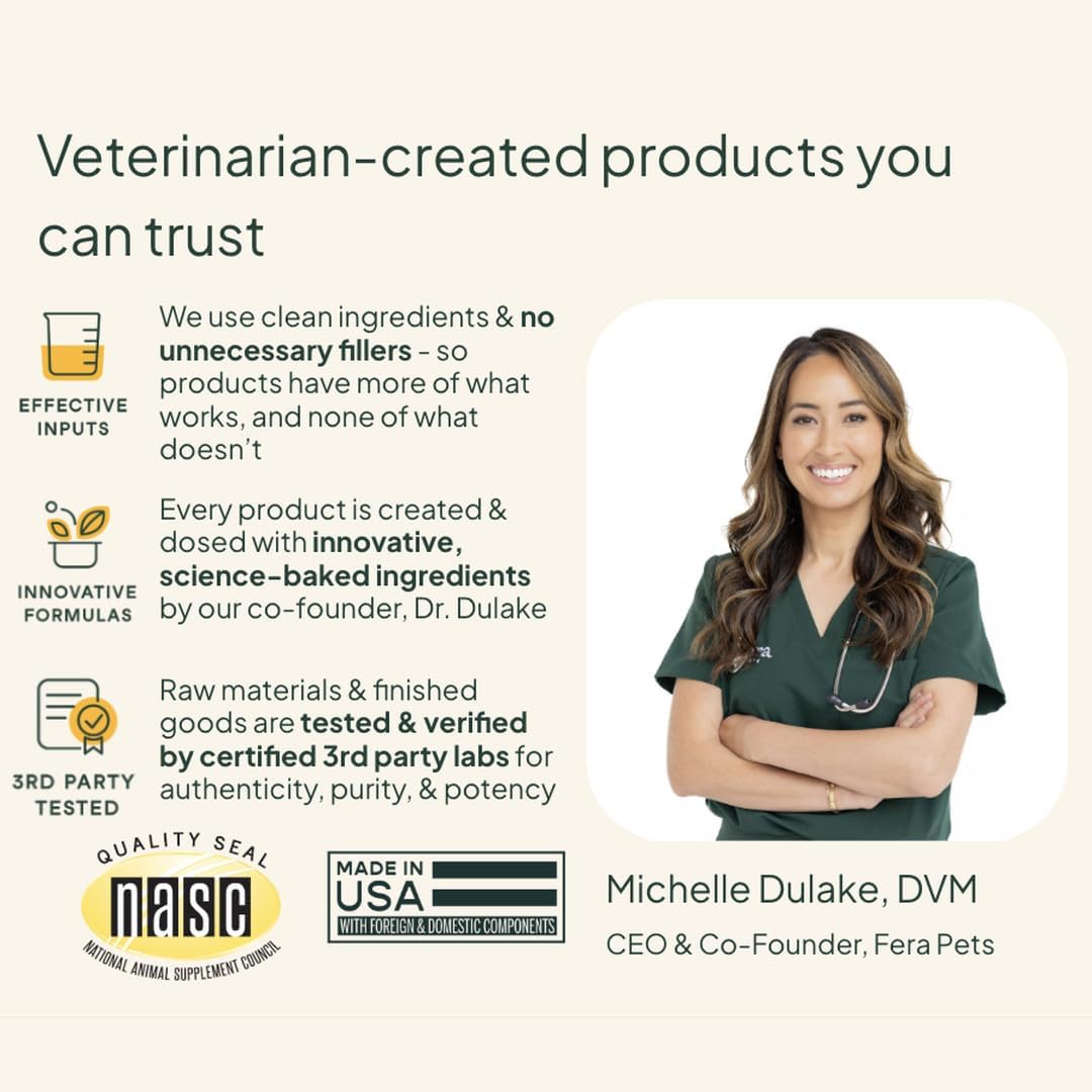 VETERINARIAN FOUNDED & FORMULATED IN THE USA: Fera’s cat and dog probiotics formula is crafted by our Co-Founder, Veterinarian Dr. Dulake; our dog and cat probiotics bear the NASC (National Animal Supplement Council) quality seal, and are made in the USA, are GMP-compliant, and do not contain colors, dyes or preservatives.