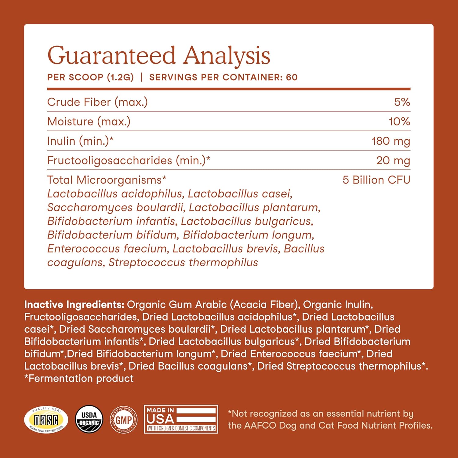 ORGANIC INGREDIENTS WITH NO FILLERS: This USDA certified organic dog and cat probiotic is formulated with 12 strains (5 billion CFUs per scoop) and organic prebiotics (acacia, agave inulin and fructooligosaccharides) for a balanced digestive tract.