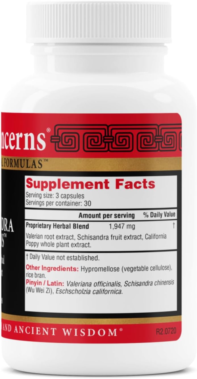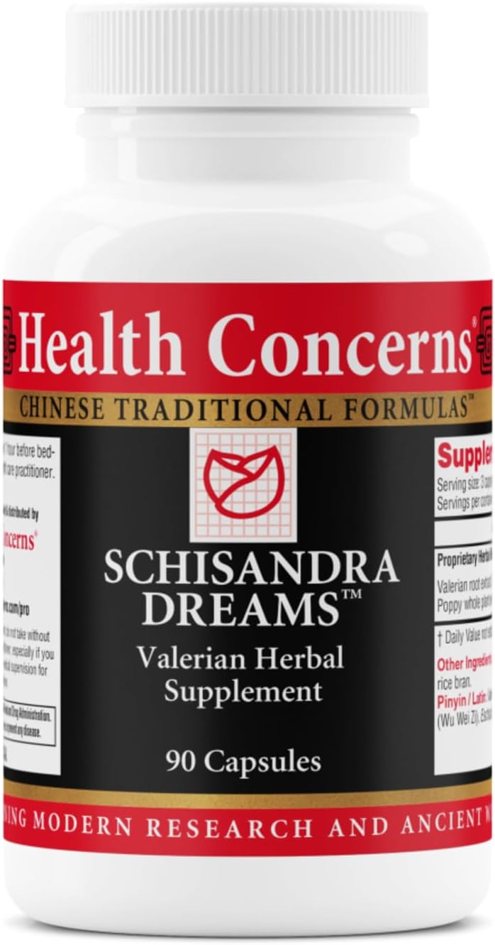 Health Concerns Schisandra Dreams is a calming herbal sleep formula combining the strengths of both Traditional Chinese Medicine and Western botanical science. With a blend of valerian root, schisandra fruit, and California poppy, this professionally-formulated supplement supports restful sleep, emotional calm, and nervous system balance. It is ideal for individuals dealing with agitation, nighttime coughing, palpitations, or restlessness related to tension, stress, or withdrawal. Each 3-capsule serving provides 1,947 mg of active herbs that nourish the heart, soothe the spirit, and promote nightly relaxation. Schisandra Dreams reflects Health Concerns’ commitment to integrating modern research with time-tested herbal traditions. Made in the USA under rigorous quality controls, this formula is trusted by professionals seeking safe and natural support for sleep and stress regulation.