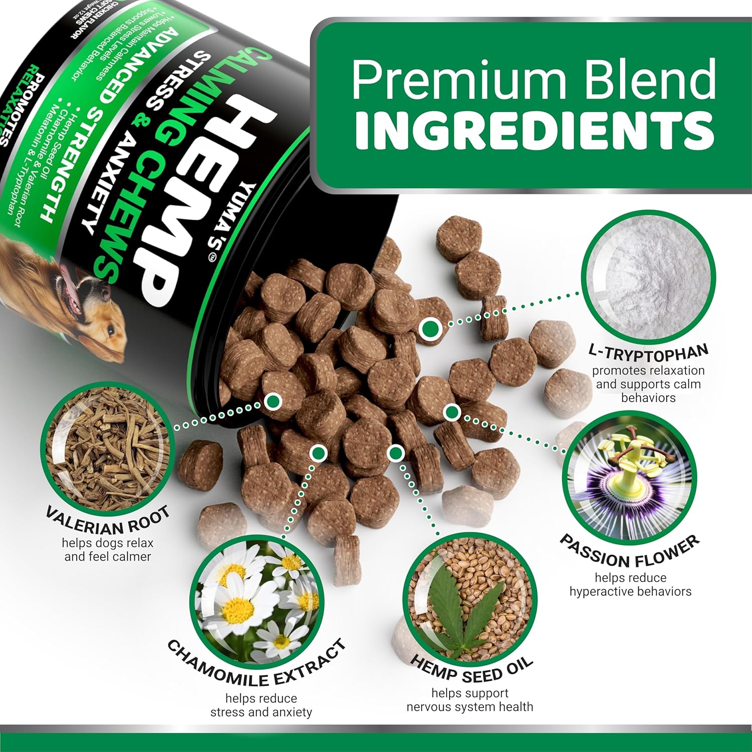 Advanced Calming Dog Treats: Packed with ingredients like hemp oil, valerian root, chamomile, and melatonin, these dog anxiety relief chews offer a safe, natural remedy for anxiety.