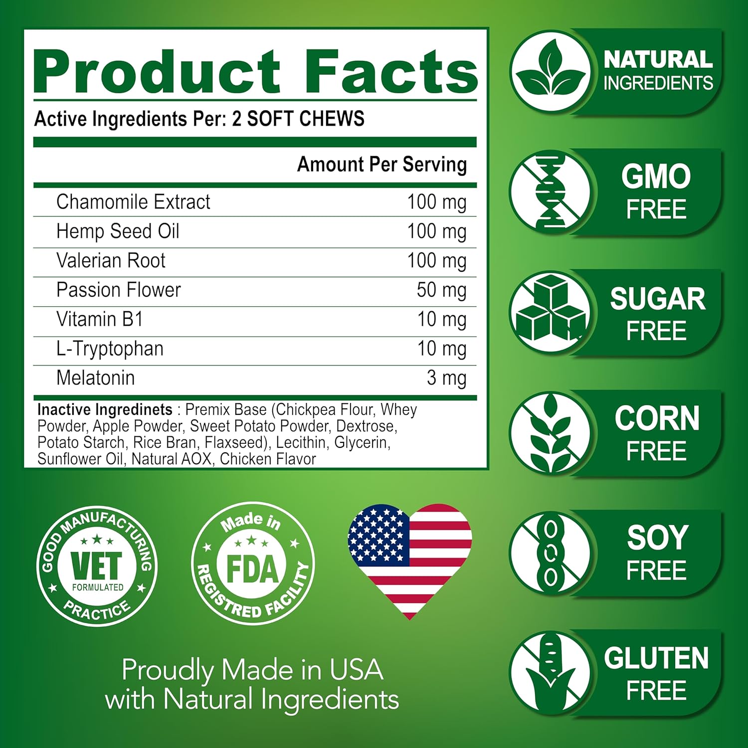 Premium Natural Ingredients Give Results: No Added Sugar, Wheat, Corn, Gmo or Preservatives. We are committed to using only best ingredients that deliver results in our dog anxiety chews