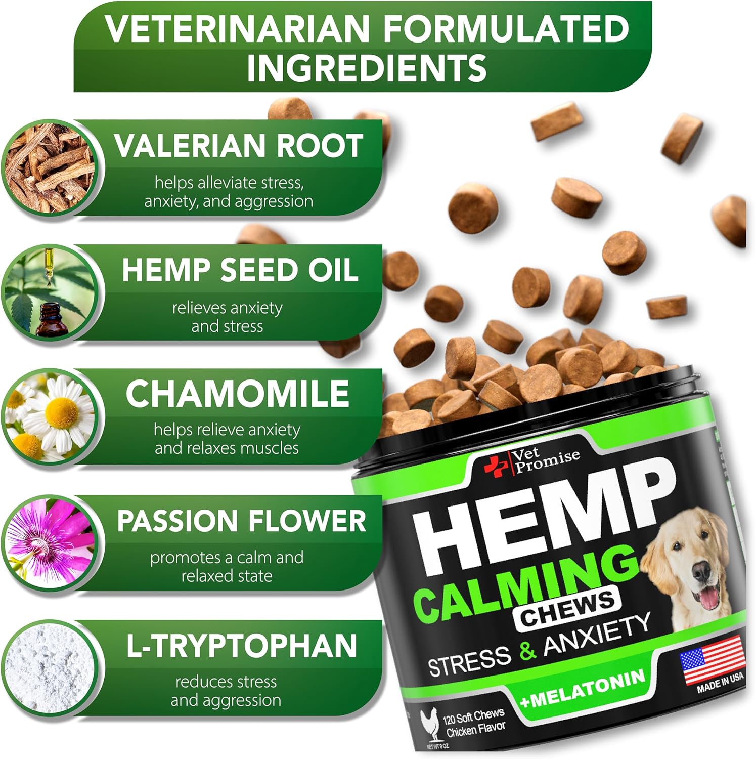 Hemp Calming Chews for Dogs with Anxiety and Stress – Dog Calming Treats – Anxiety Relief – Separation – Travel – Barking – Melatonin – Hemp Oil – 120 Soft Treats – Made in USA