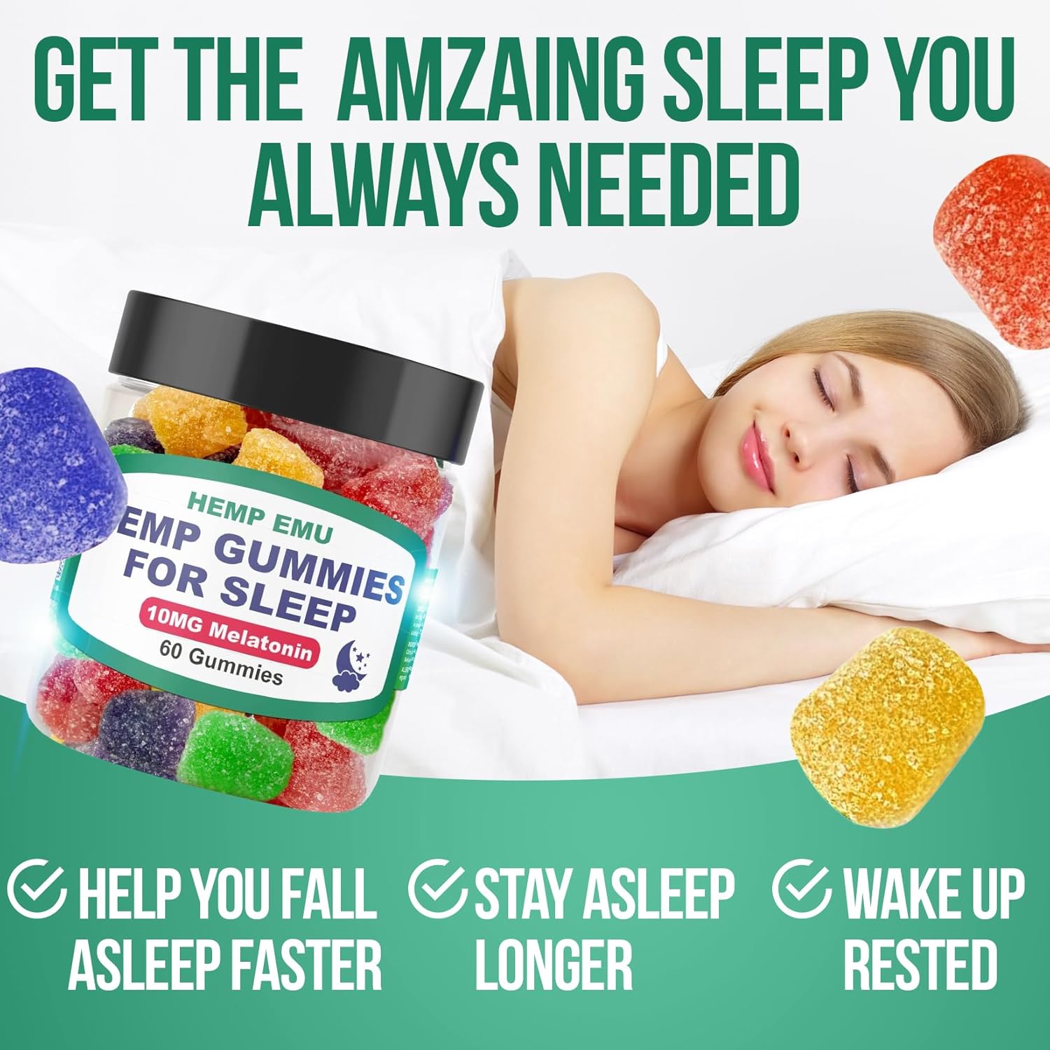 Hemp Emu Gummies For Sleep, made with 99% Pure Melatonin & Premium Hemp Extract to help you fall asleep faster, stay asleep longer, and wake up rested.