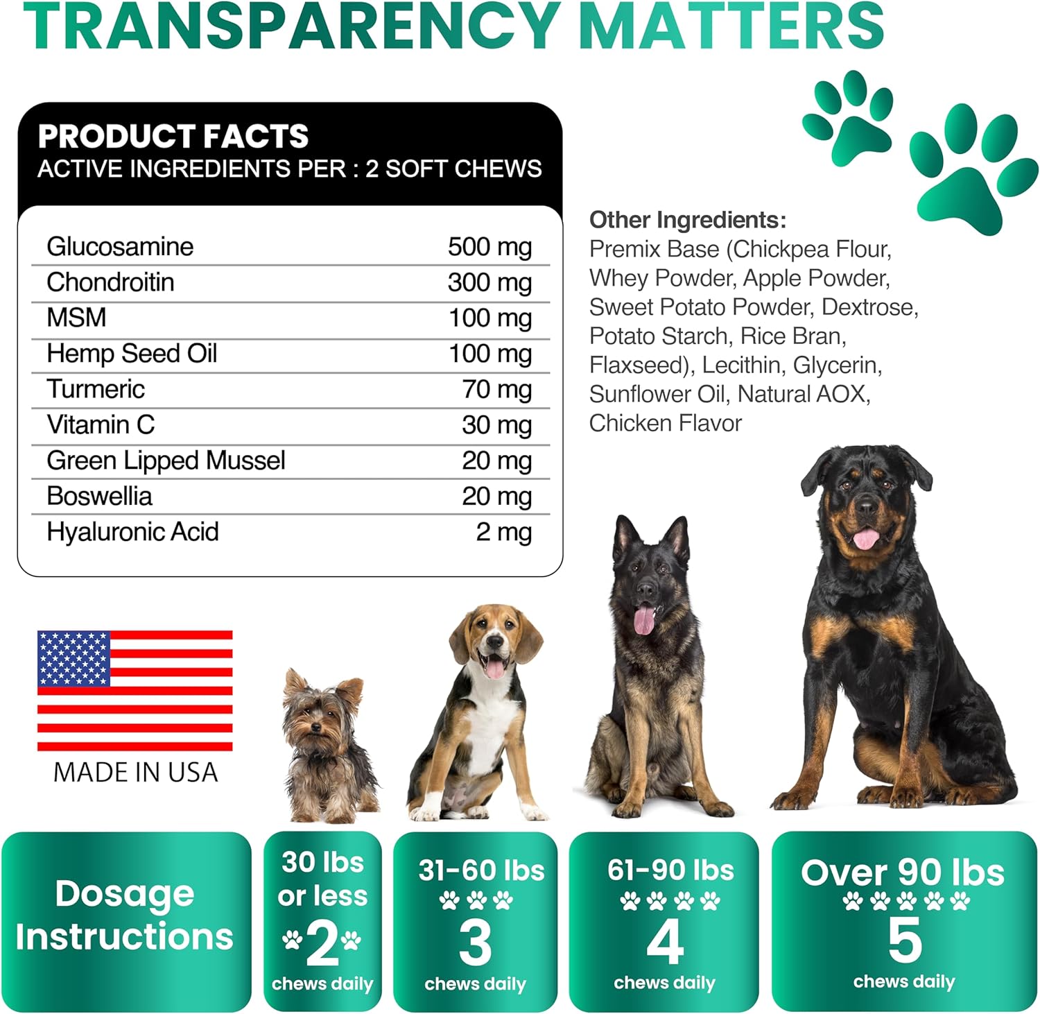 Vet Recommended: Our glucosamine chondroitin for dogs supplement is made in the USA under strict supervision, using all-natural and safe ingredients. No GMOs, artificial fillers, flavors or sugar