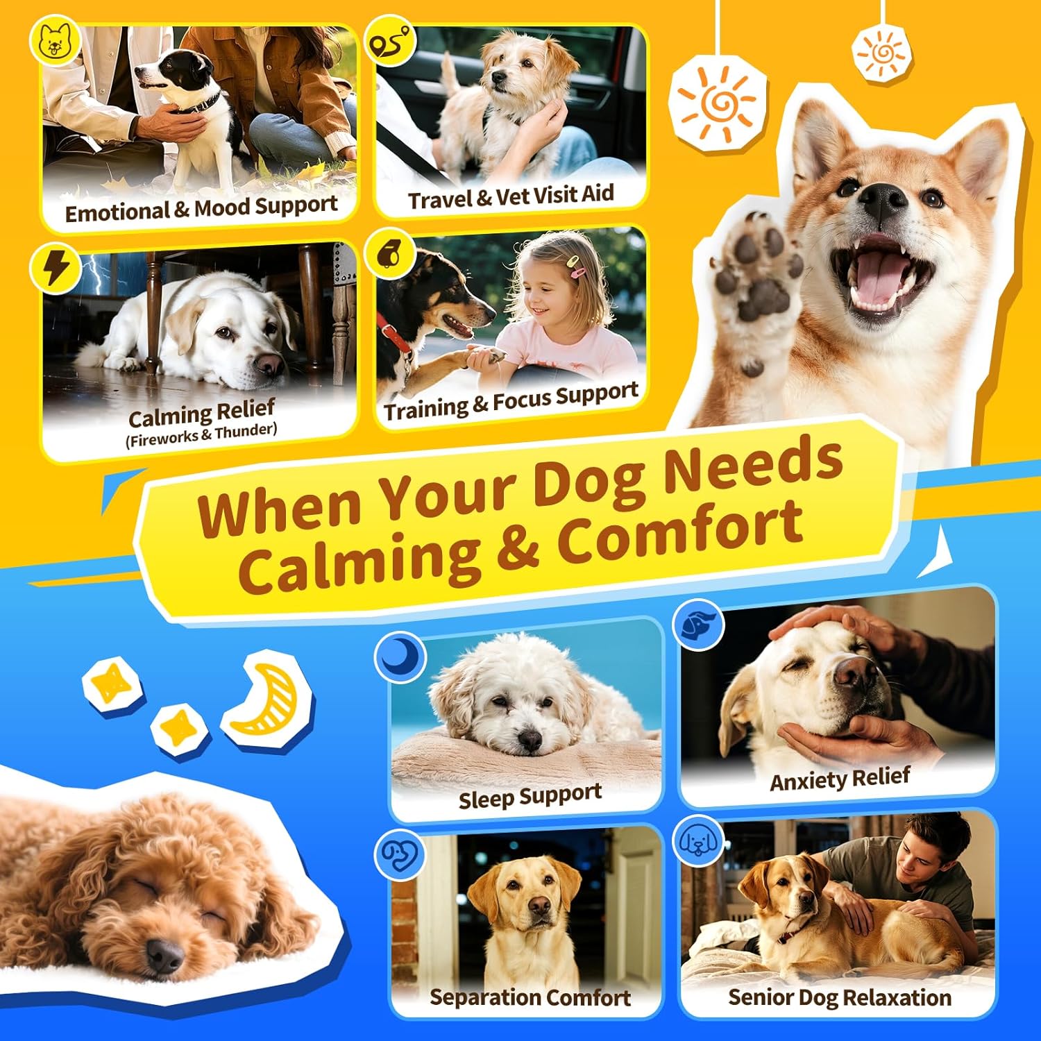 Day & Night Calming Treats for Dogs: POPPAW’s Day & Night Calming Aid Set offers anxiety relief for dogs around the clock. The daytime dog calming formula helps soothe stress during thunderstorms, vet visits, or separation, while the nighttime blend, featuring melatonin for dogs, promotes deep, restful sleep. Perfect for loud noises, travel, or bedtime, this set keeps your pup relaxed and content.