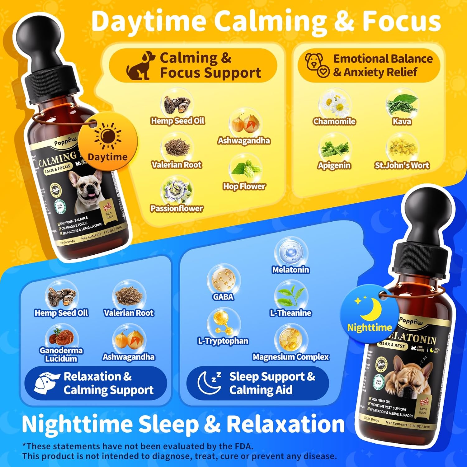 Natural & Science-Backed Ingredients: Our calming treats for dogs combine powerful botanicals like Hemp Seed Oil, Valerian Root, and Ashwagandha with science-backed ingredients. The daytime formula enhances focus and eases tension—ideal for training or behavioral issues. The nighttime mix includes melatonin for dogs, Magnesium, GABA, and L-Theanine to support older dogs or restless pups, ensuring a full night’s sleep.