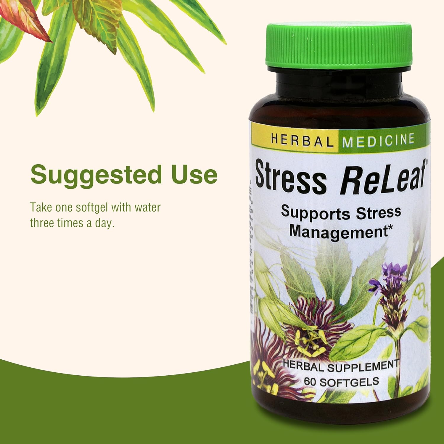 Dosage Instructions: Take one softgel of Stress ReLeaf three times daily with water to support a calm attitude