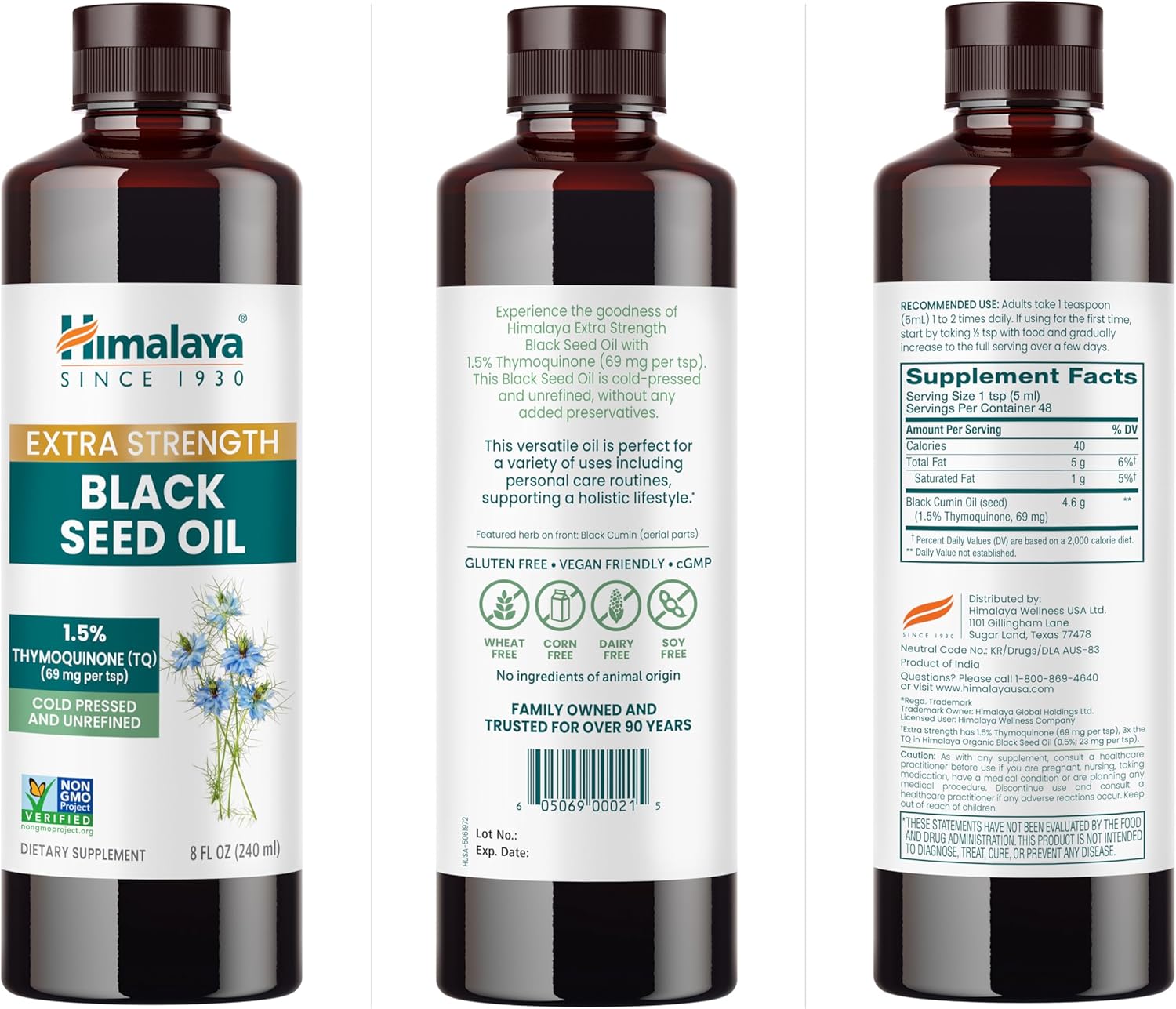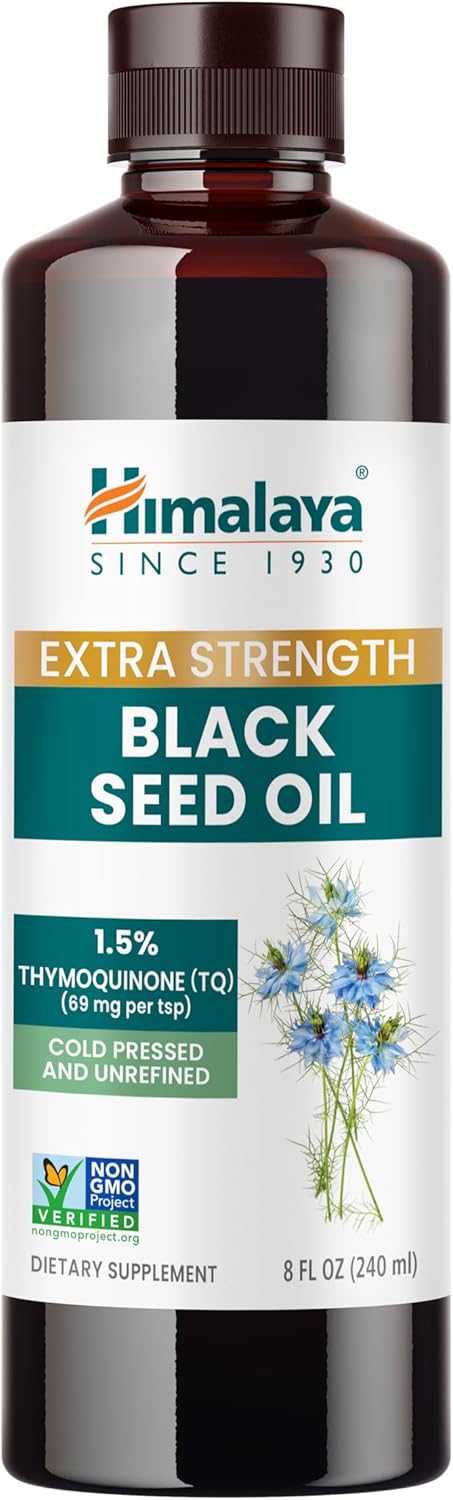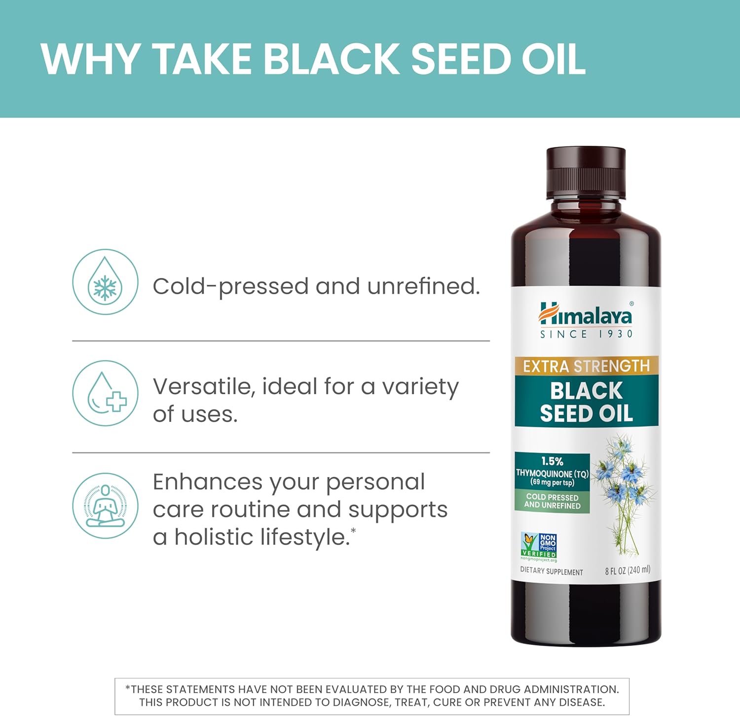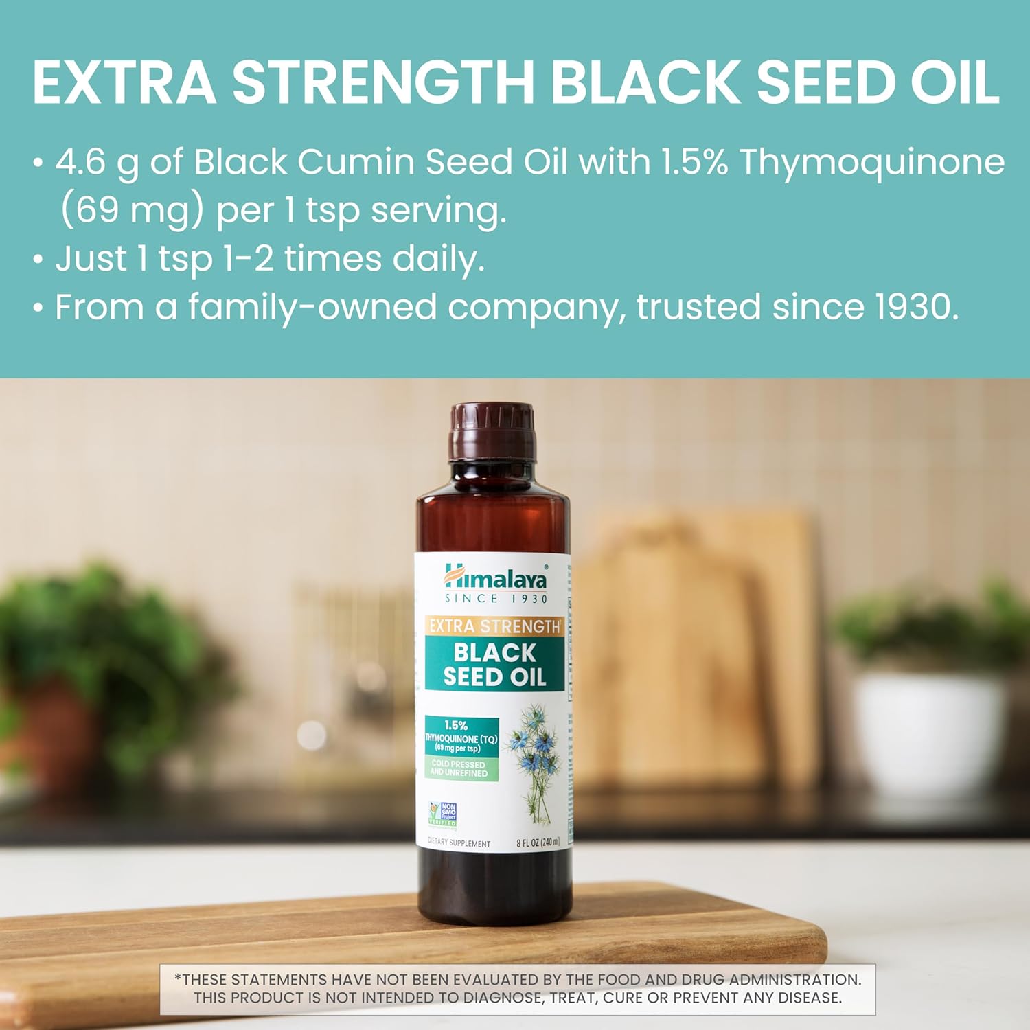 EXTRA STRENGTH BLACK SEED OIL: Unlock the benefits of Himalaya Extra Strength Black Seed Oil, featuring 1.5% Thymoquinone (69 mg per teaspoon). This premium oil is cold-pressed and unrefined, ensuring you receive the quality and goodness of Black Seed Oil for your wellness and personal care needs.*