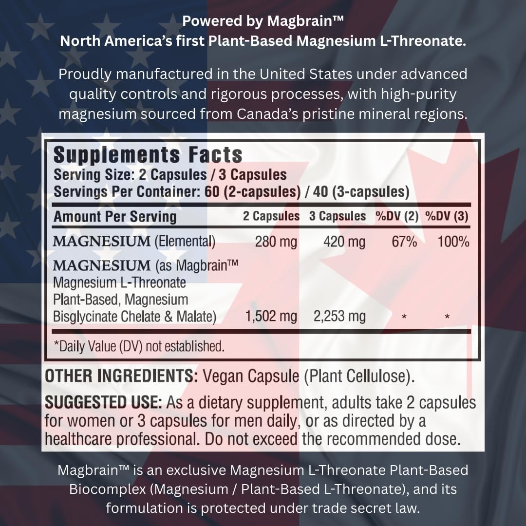 High-Potency Magnesium L-Threonate Plant-Based. Manufactured in Texas, USA. Each 3-capsule serving provides 420 mg elemental magnesium (280 mg per 2 capsules).