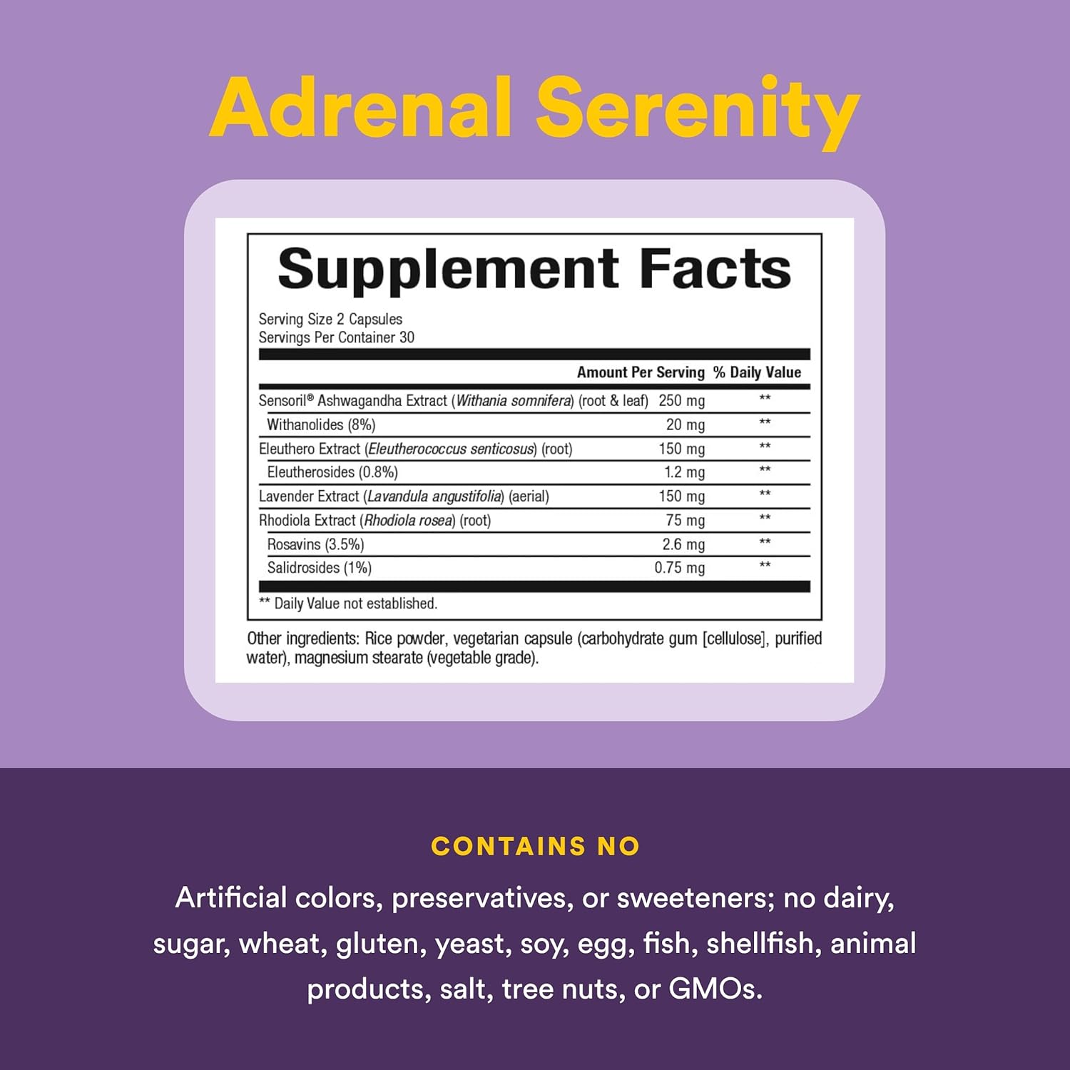 Life is full of demands. From those at work and school to those at home, finding the time to relax and focus can be difficult. Powerful and comprehensive, Stress-Relax Adrenal Serenity provides a unique combination of adaptogenic herbal extracts that help the body cope with occasional stress and promote emotional well-being. With a relaxing blend of herbal extracts, Stress-Relax Adrenal Serenity contains Sensoril ashwagandha (for managing and reducing stress and irritability), eleuthero extract (for adrenal function support), lavender extract (demonstrated to reduce feelings of low mood and occasional anxiety and helplessness) and rhodiola (for adaptogenic balancing of brain functions like memory, attention and sleep).