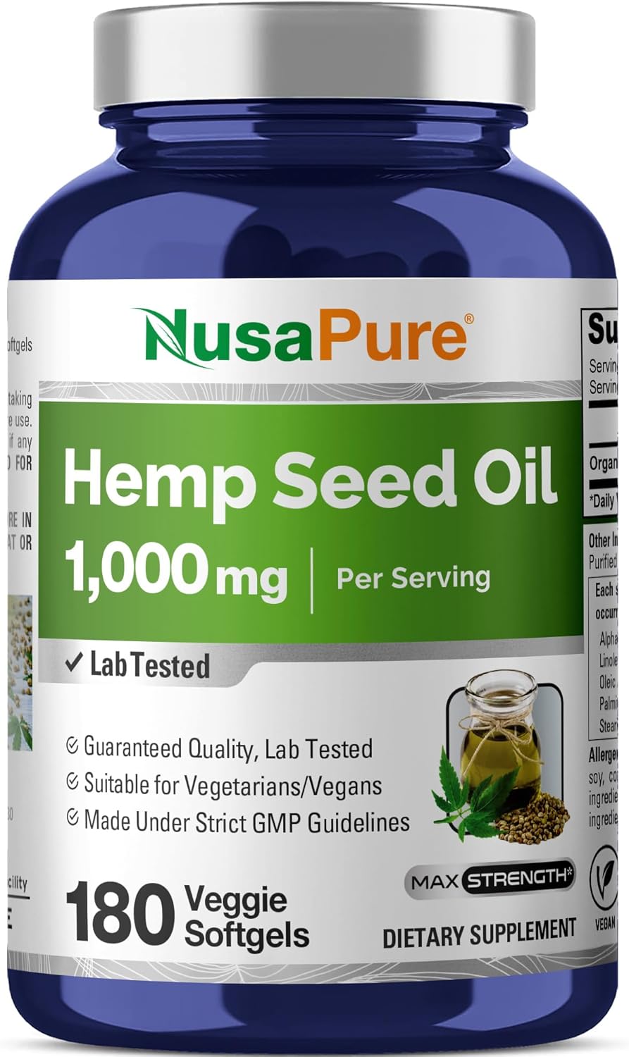NusaPure Hemp Oil 1,000mg Per Serving, 180 Veggie Softgels, Non-GMO, Vegan