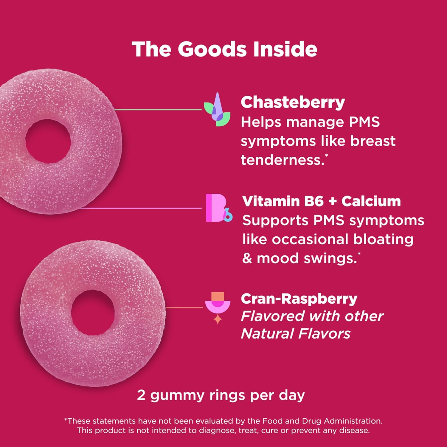 Feeling hormonal? That’s normal, and we’ve been there. This unique formula supports you through your cycle and helps you find ease from your (not so fun) PMS.* Put PMS in its place. Chasteberry, a plant extract, helps manage symptoms like breast tenderness, so you can get the weight of worrying about PMS off your chest—literally. Vitamin B6 and Calcium support PMS symptoms. Calcium helps manage occasional bloat & supports mood swings so you can have fewer ups, downs & all-arounds.* Take 2 gummies daily, chew thoroughly before swallowing. These gummies delight your tastebuds with a blend of tart cranberry & sweet raspberry flavors. Formulated with no synthetic flavors or colors and gluten free. *These statements have not been evaluated by the Food and Drug Administration. This product is not intended to diagnose, treat, cure or prevent any disease.