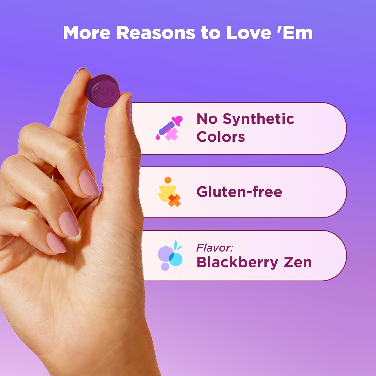 OLLY Sleep gummies for adults deliver a unique blend of active ingredients that work together to calm your mind and promote restful sleep so you wake up feeling refreshed. These Melatonin gummies, with L-Theanine and Botanicals like Chamomile and Lemon Balm, work with your body to help you fall asleep and stay asleep.* Naturally flavored with Blackberry and a hint of mint, Sleep gummy vitamins help you drift off. They’re naturally delicious, scientifically formulated and gluten-free. Good health is at the center of everything we do. That’s why we’ve made it our mission to make nutrition easy to understand. We do it by crafting products that are as effective as they are delicious—because we know when something feels good, you’re more likely to do it.* *These statements have not been evaluated by the Food and Drug Administration. This product is not intended to diagnose, treat, cure or prevent any disease. For occasional sleeplessness. CAUTION: Melatonin may cause drowsiness or sleepiness; do not take while driving, operating machinery, or engaging in any activity that requires alertness. This product is not intended to treat insomnia or other sleep disorders.