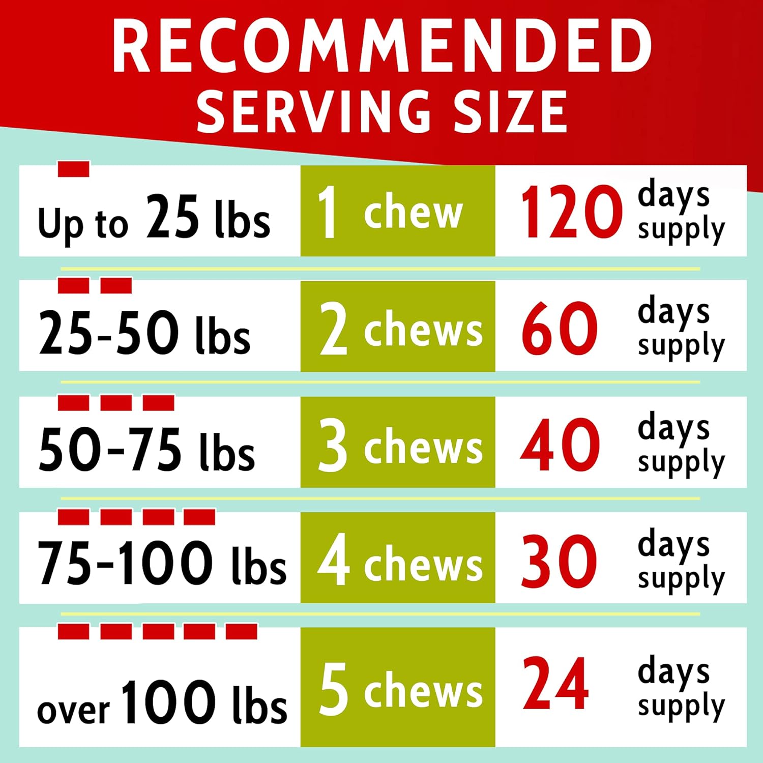 For the dog’s weight up to 25lb the daily dose is 1 chew, for 25-50lbs = 2 chews per day, for 50-75lbs = 3 chews, for 75-100lbs = 4 chews, for over 100lbs = 5 chews per day.
