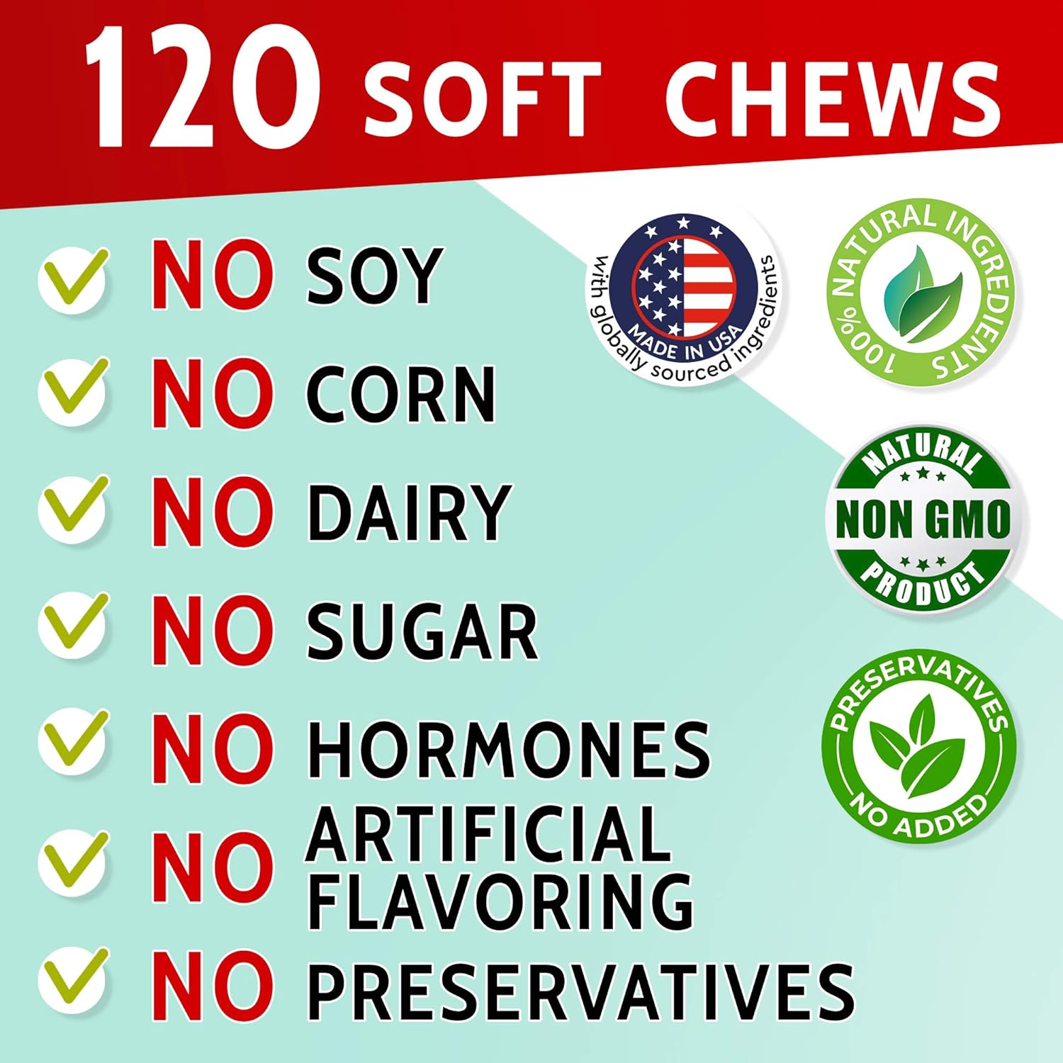 Made in USA, following strict GMP standards, with all natural component and ingredients. These treats don’t contain any soy, corn, dairy, sugar, hormones, artificial flavoring or preservatives.