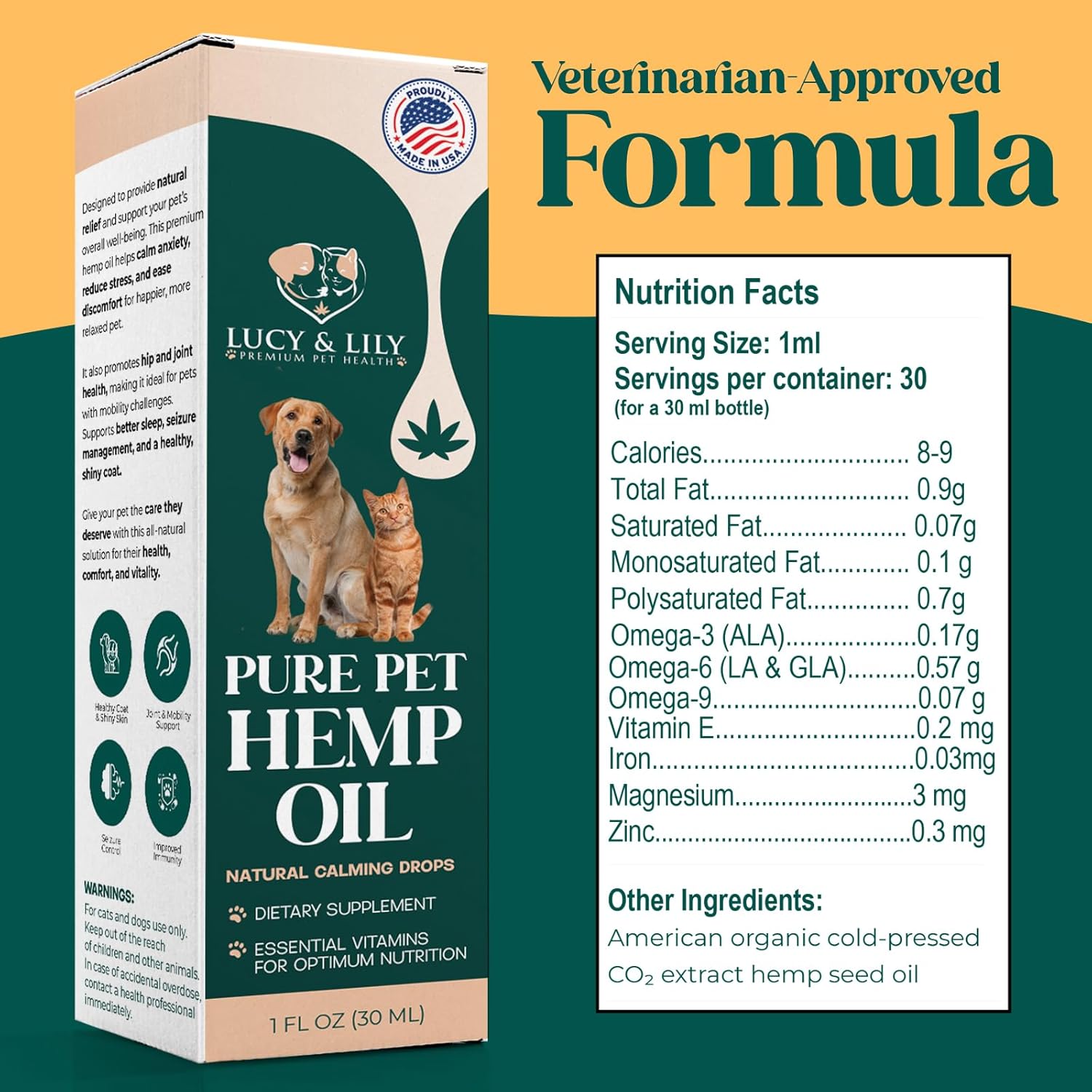 THE PUREST, 1-INGREDIENT HEMP OIL FOR YOUR PET’S WELLNESS: The Lucy and Lily hemp oil for cats and dogs contains only one ingredient: the purest, most potent hemp seed oil. Naturally packed with essential fatty acids, vitamins, protein and antioxidants, our hemp drops support long-term health and wellness for any pet, including cats, dogs and even rabbits and horses.