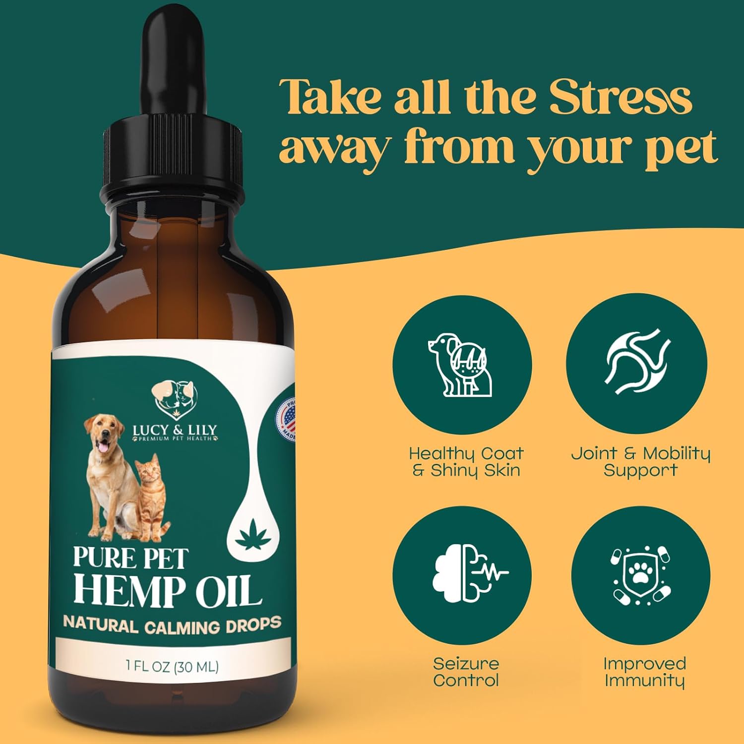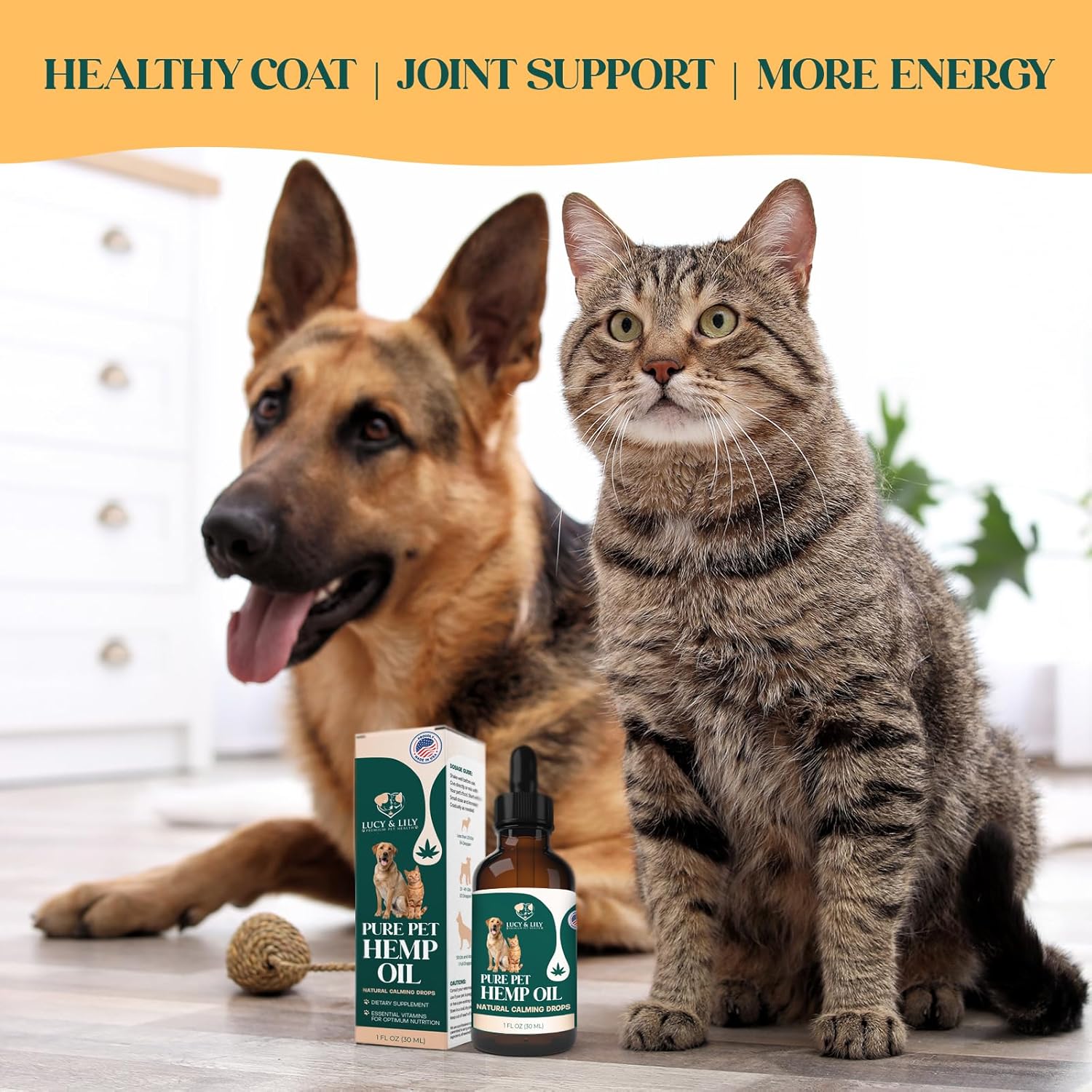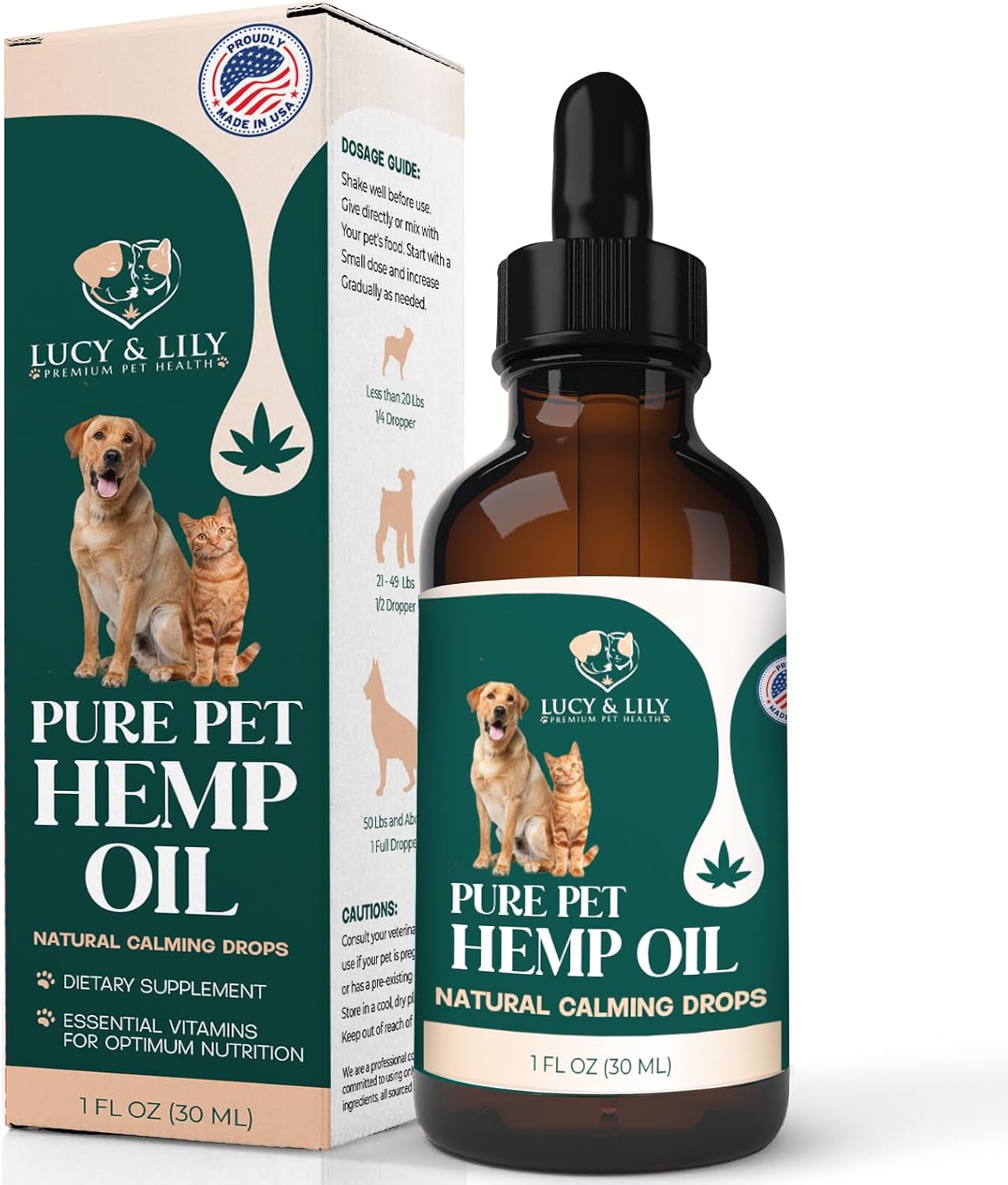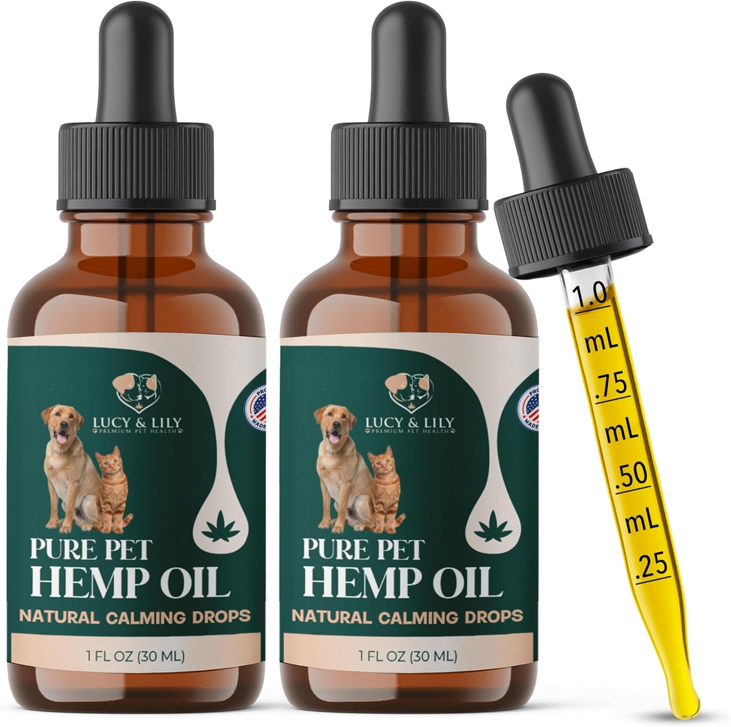 LUCY AND LILY 100% PURE HEMP OIL FOR PETS – THE ULTIMATE NATURAL HEMP SUPPLEMENT TO KEEP ANXIETY AT BAY AND SUPPORT YOUR PET’S ALLOVER WELLNESS! Seeing your furry best friend struggling in crowded places or on travels is hard, for you and for them. PURE. POTENT. POWERFUL. ONE INGREDIENT HEMP OIL: NO GMO, NO ARTIFICIAL TASTE. NO FILLERS. [DOSAGE GUIDE INCLUDED] Formulated by professional veterinarians, our hemp seed oil extract for pets makes a safe and natural choice for any cat or dog that struggles with stress and anxiety. Hemp’s natural calming properties reduce stress and anxiety levels, allowing for a more comfortable daily routine. Perfect for: – Separation Anxiety – Grooming & Vet Visits – Traveling & Car Rides – Fireworks & Loud Places Designed for easy intake even with fussy eaters, our hemp oil can be mixed with food, added to your pet’s water or applied directly into its mouth. The handy dropper and the detailed dosage guide eliminate guesswork for easy, worry-free use. NATURALLY PACKED WITH VITAMINS, FATTY ACIDS AND ANTIOXIDANTS FOR HEALTHY PETS INSIDE OUT. No pet supplements compare to the natural, nutrient-packed formula of our Hemp oil for sleep and anxiety. Rich in vitamins, minerals, fatty acids and antioxidants, a few drops a day can provide an array of benefits for your pet: * Healthy Coat & Shiny Skin * Pain Relief From Arthritis & Aging * Joint & Mobility Support * Seizure Control * Improved Immunity PROUDLY DESIGNED IN AMERICA | PROUDLY DONATING TO ANIMALS THAT NEED OUR SUPPORT At Lucy & Lily, we love giving back to all the furry friends that need some extra love. We wholeheartedly donate our hemp oil to local animal shelters via our charity partners ASPCA and the World Wildlife Fund. REDUCED STRESS, IMPROVED WELLNESS, ALLOVER CARE. EVERYTHING YOUR PET NEEDS, ONE DROP AT A TIME. ORDER YOURS TODAY!