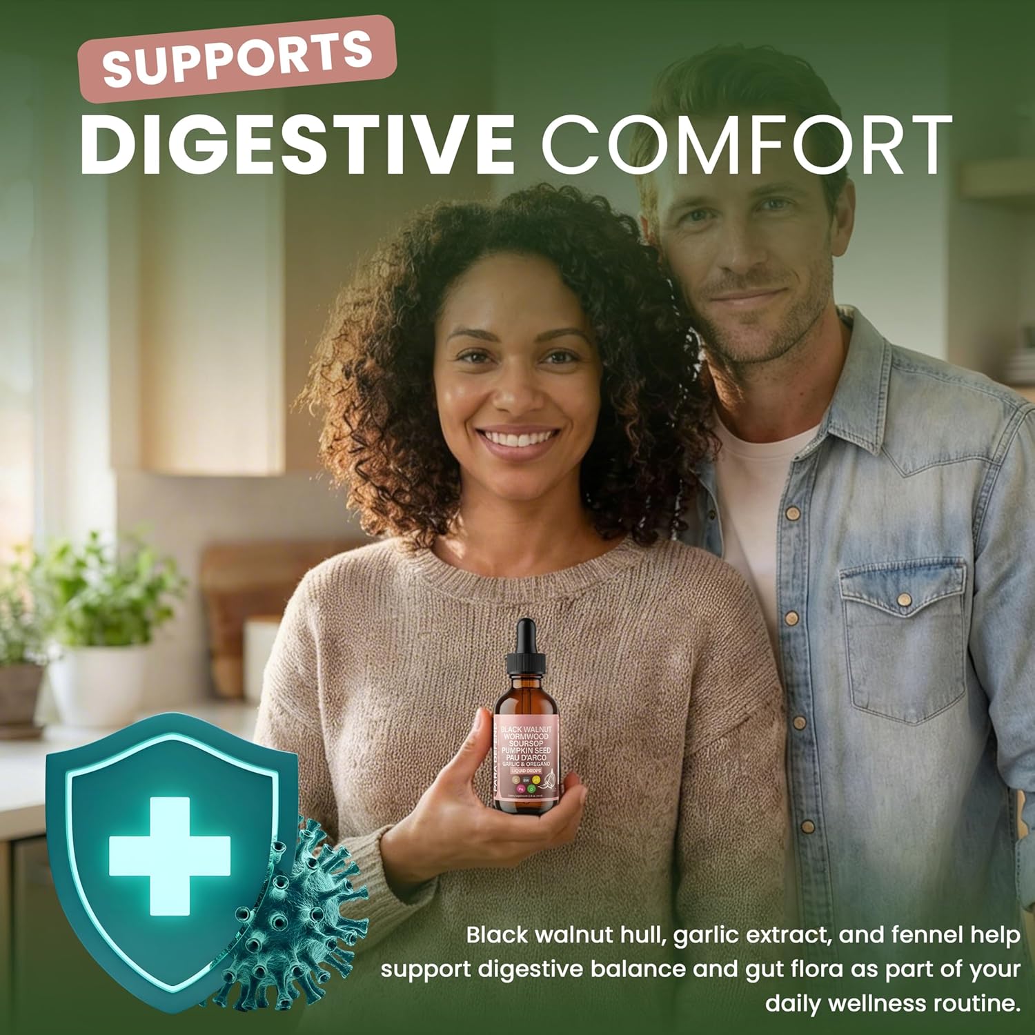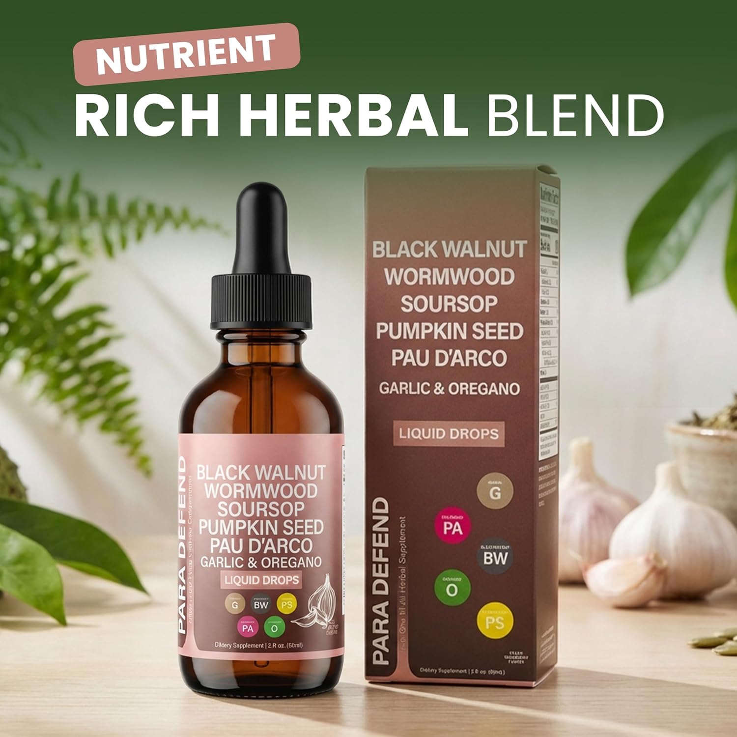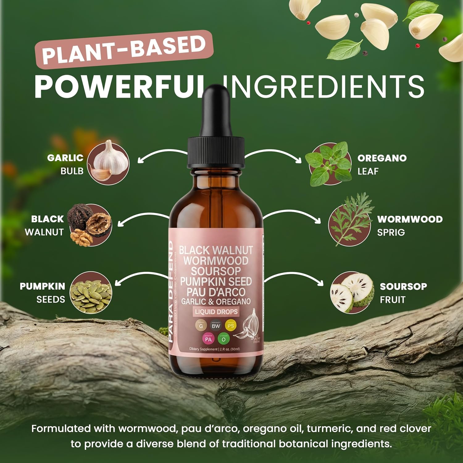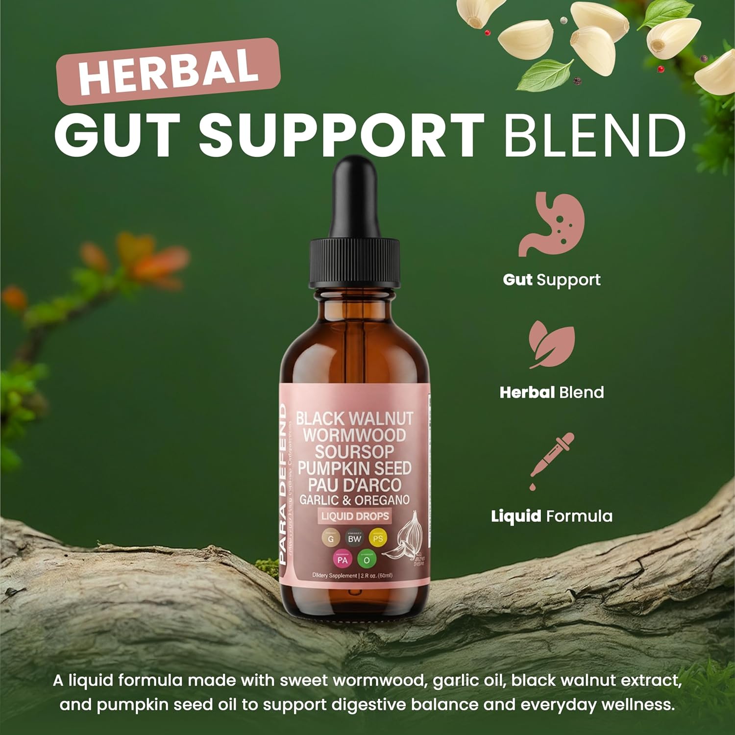 Comprehensive Herbal Blend: Features black walnut, wormwood, pumpkin seed, pau d’arco, garlic, oregano, turmeric, neem and soursop in a carefully crafted liquid formula for daily balance.