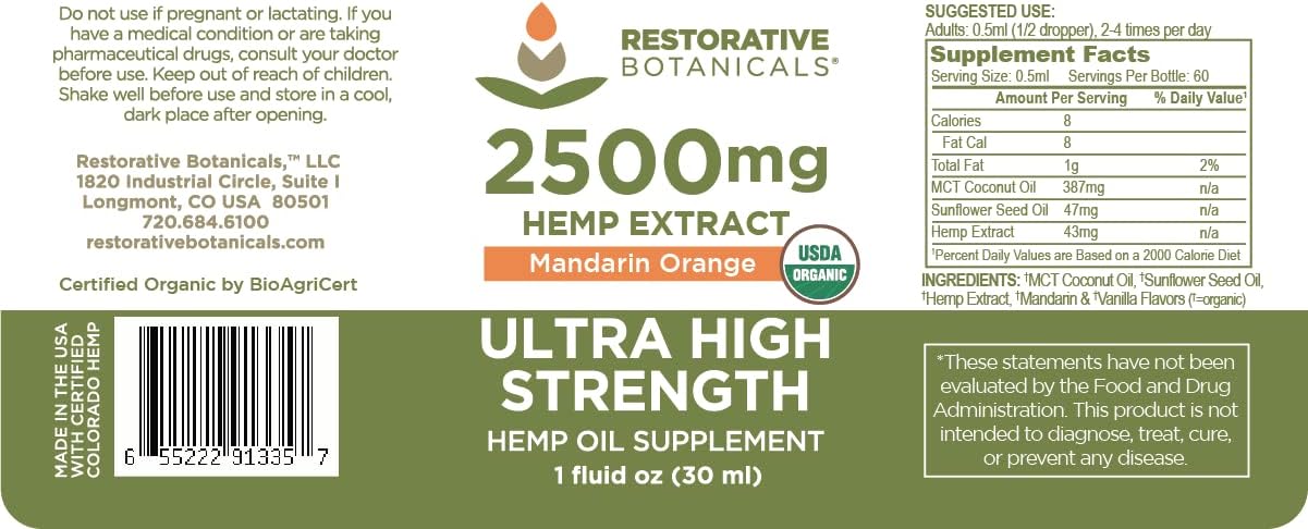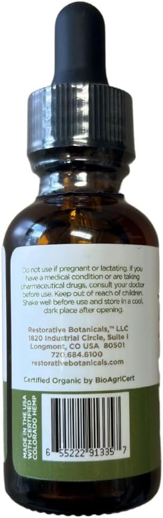 USDA Certified Organic Hemp Oil Supplement manufactured in Restorative Botanicals state licensed, FDA registered, GMP certified facility from USA grown Certified Organic hemp plants and extracts. Third party certification demonstrates Restorative Botanicals commitment to quality and consistency.