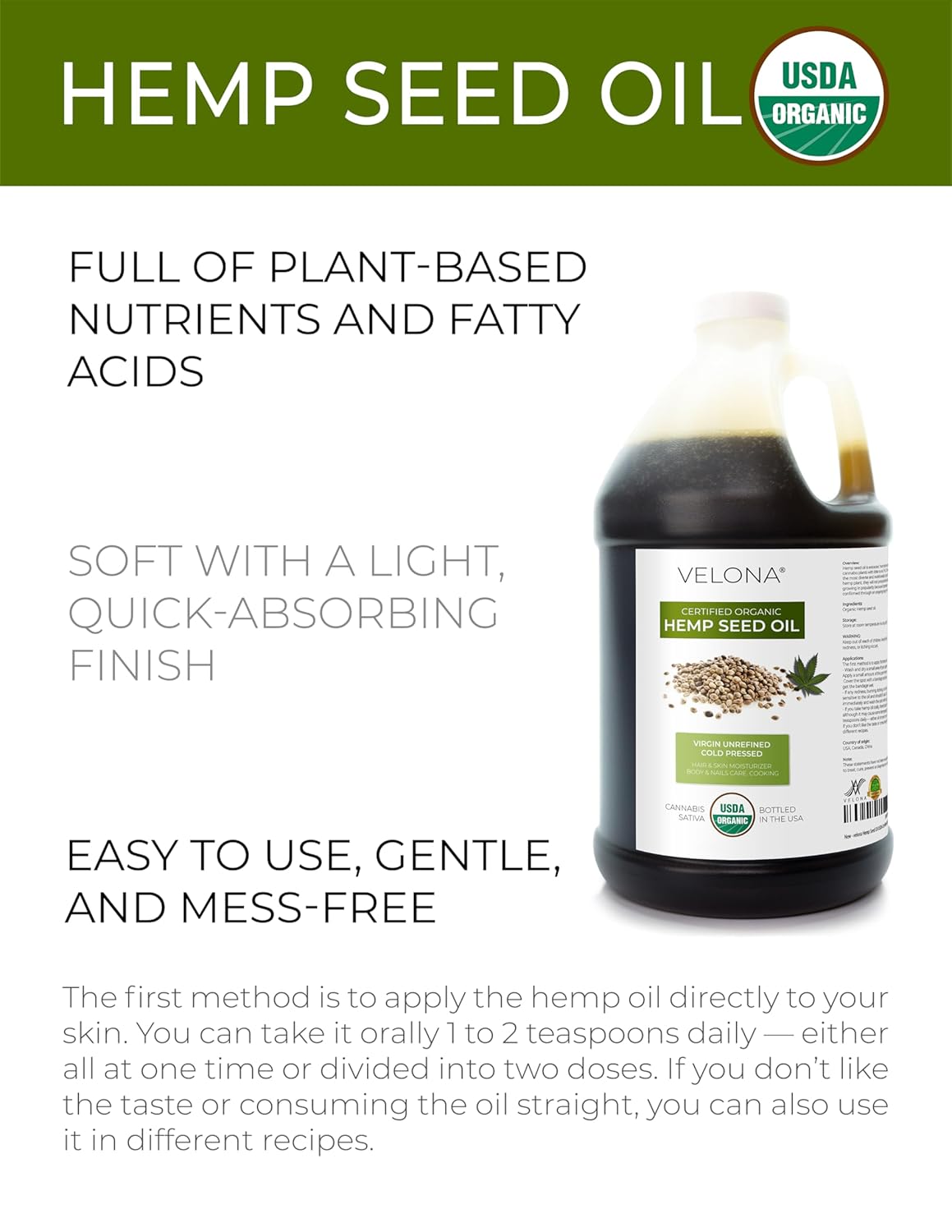 velona Hemp Seed Oil USDA Certified Organic – 64 Fl Oz | 100% Pure and Natural Carrier Oil | Unrefined, Cold Pressed | Hair, Body, Face & Skin Care