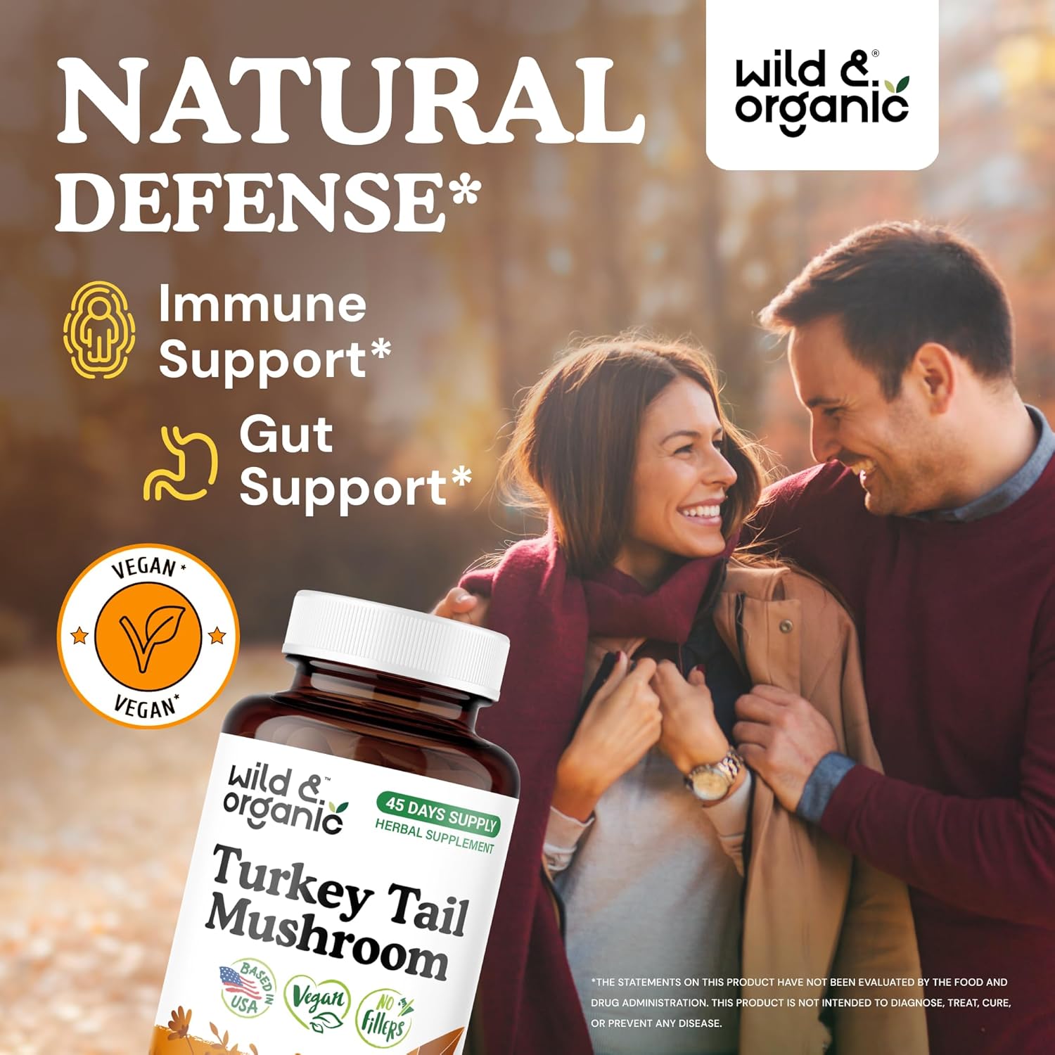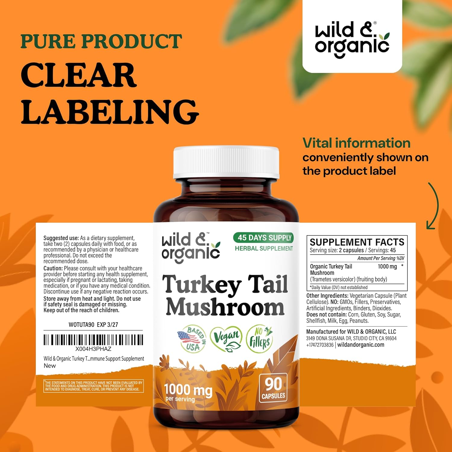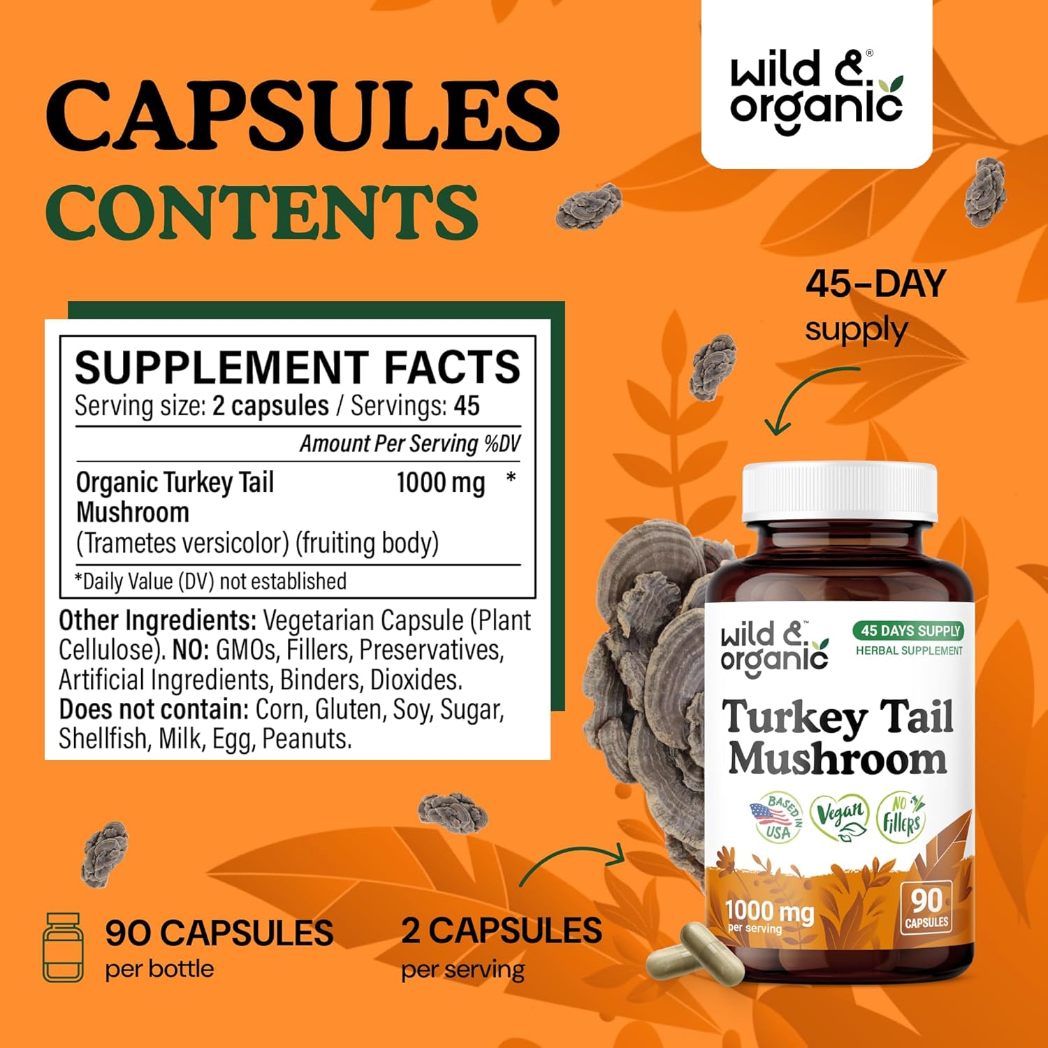 Immune Support: Each serving of Wild & Organic turkey tail mushroom capsules contains 1000 mg of turkey tail mushroom extract for immune support.