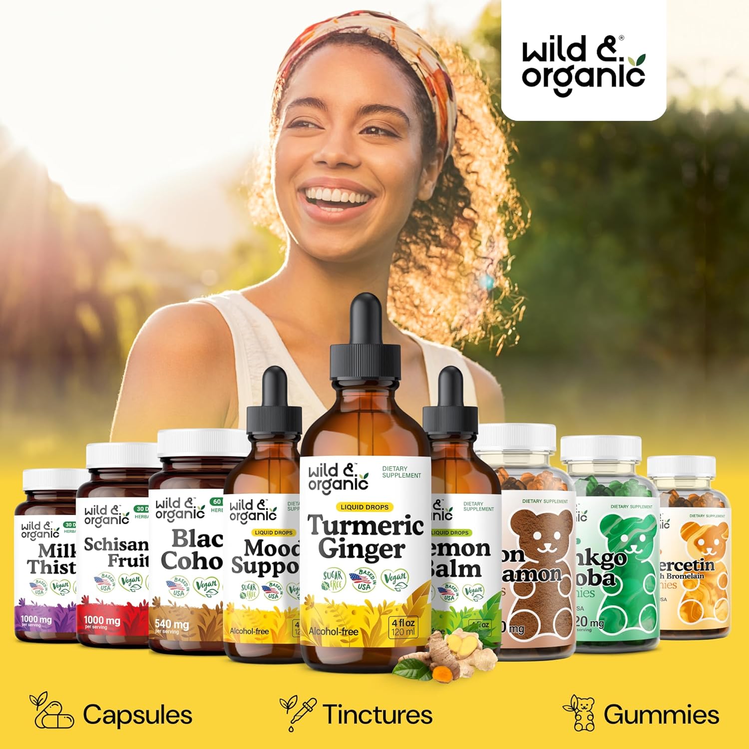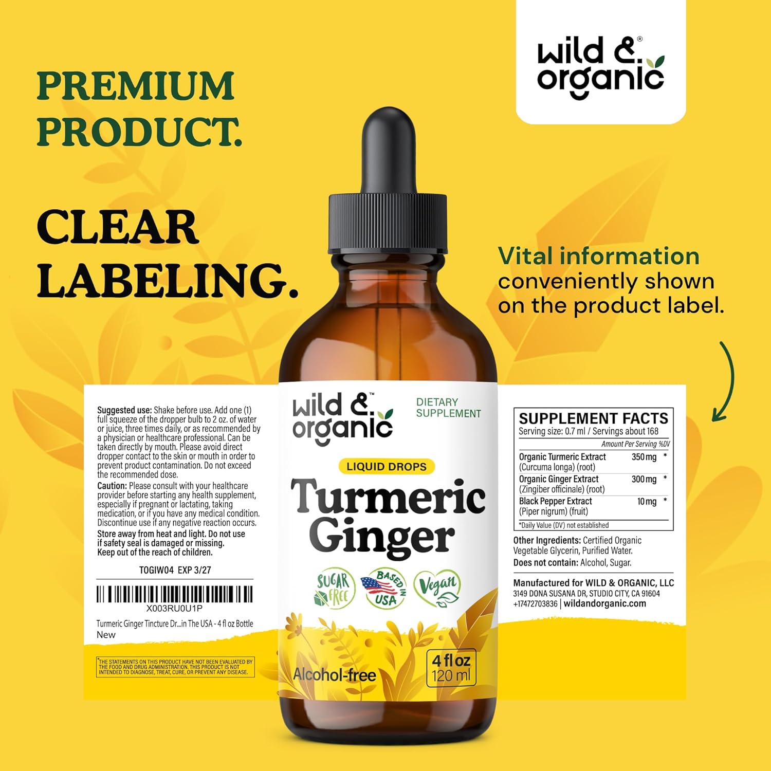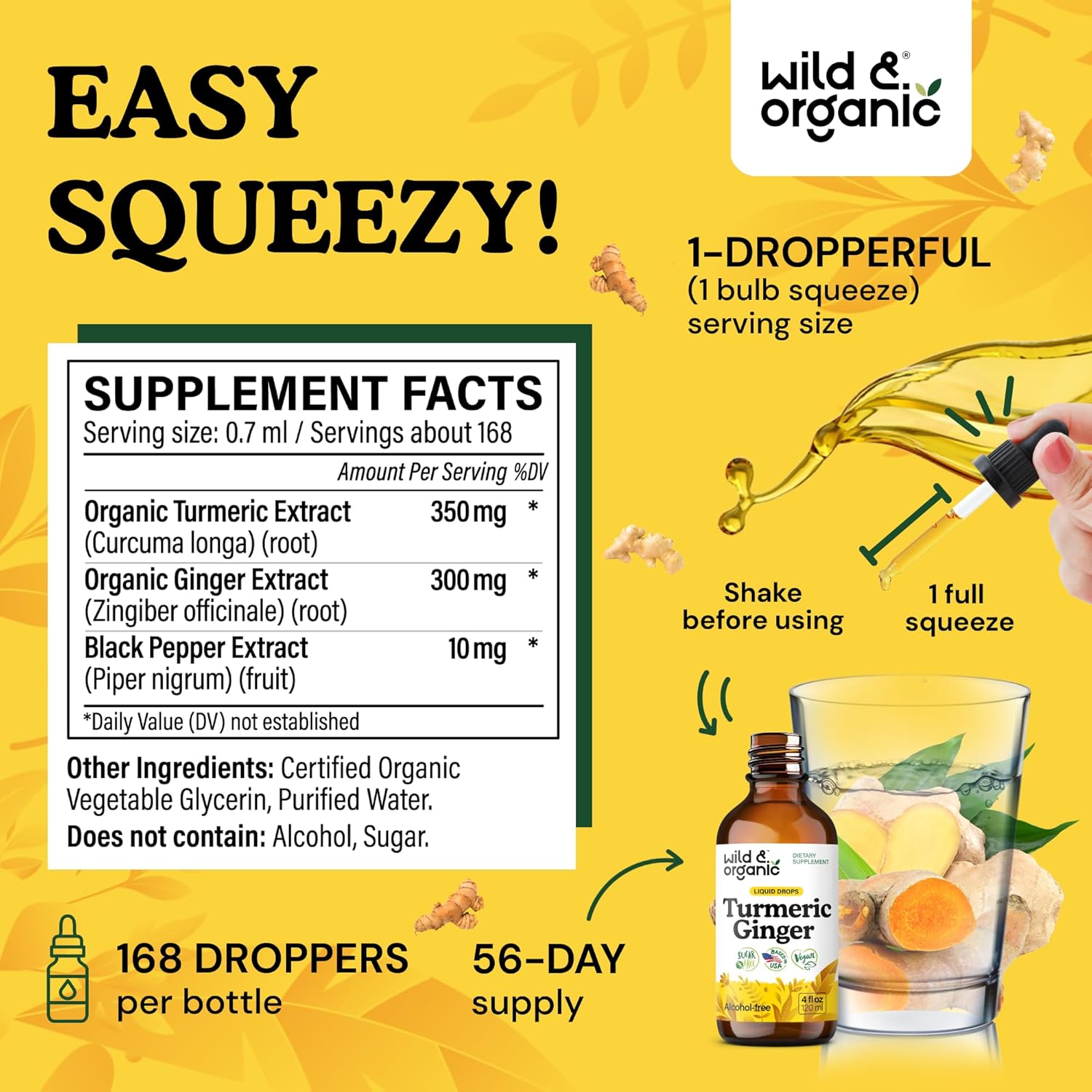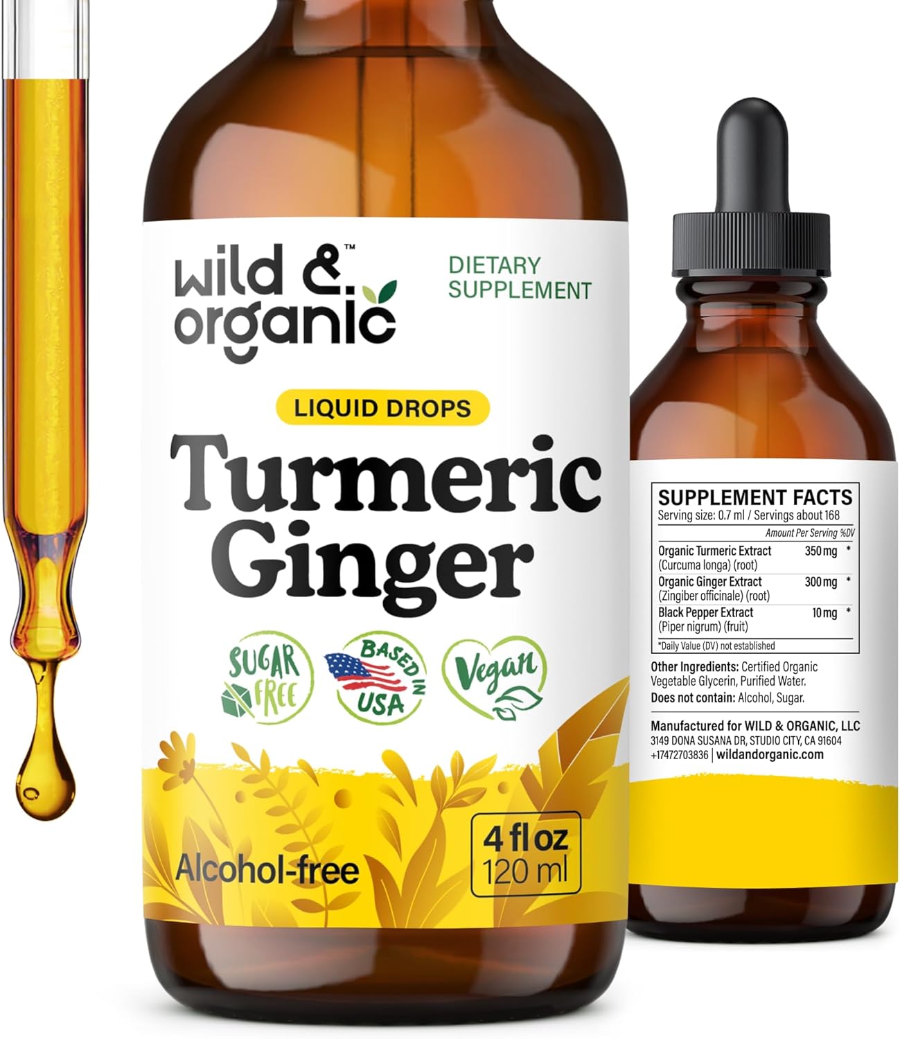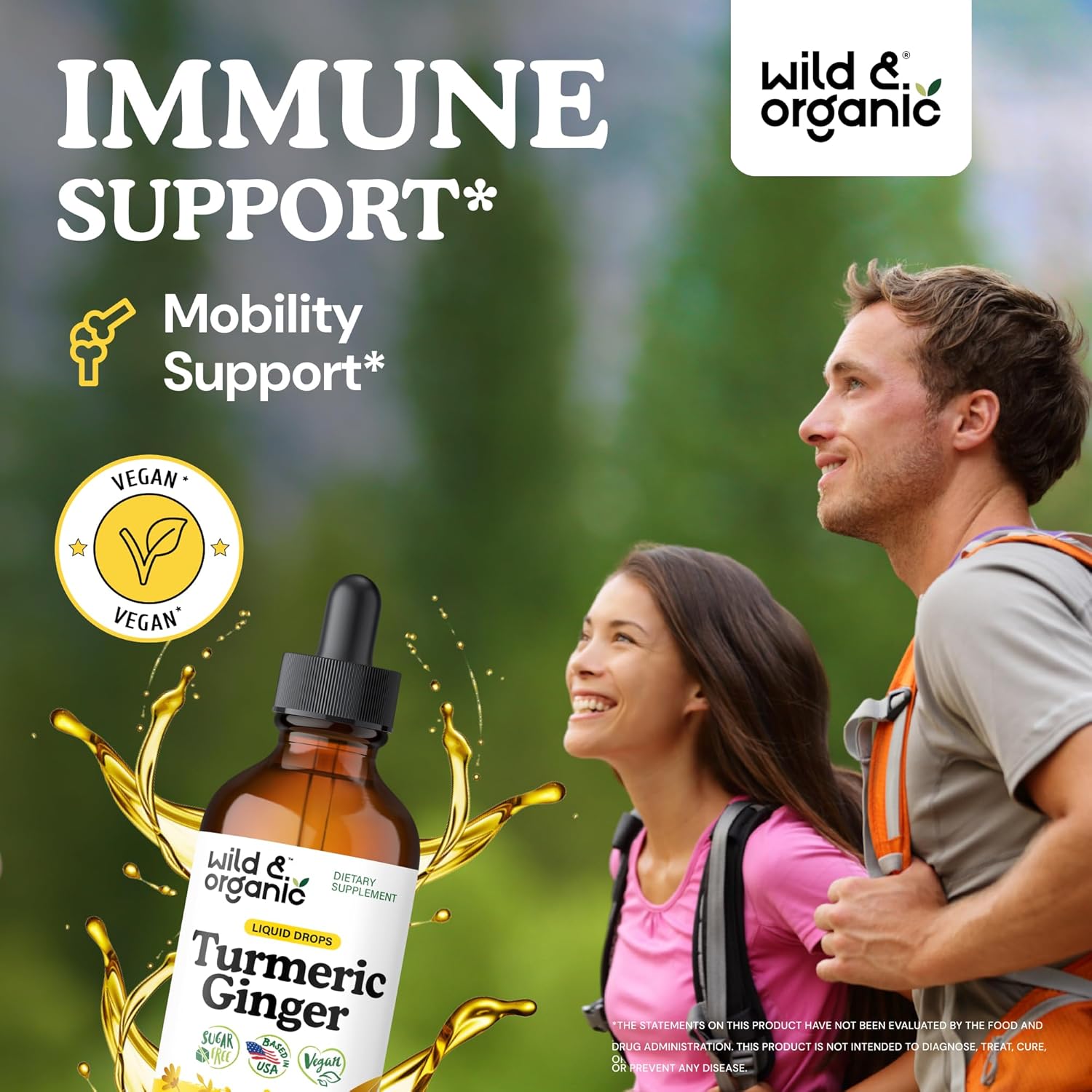 Wild & Organic Turmeric and Ginger Supplement Drops – Joint & Immune Support – Liquid Turmeric Curcumin with Black Pepper and Ginger – Curcumin Supplement – Vegan, Sugar & Alcohol-Free Tincture – 4 oz