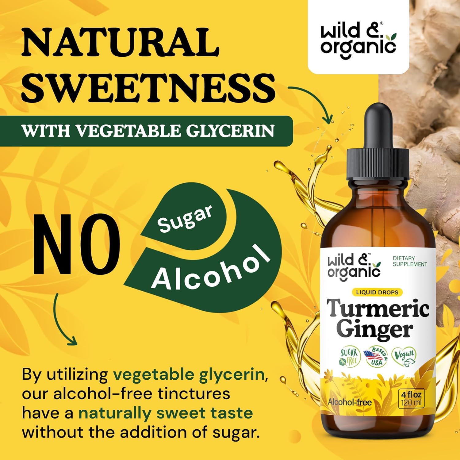 Alcohol-Free: Wild & Organic turmeric curcumin with ginger is vegetable glycerin-based, providing an alcohol-free tincture that is easy on digestion.