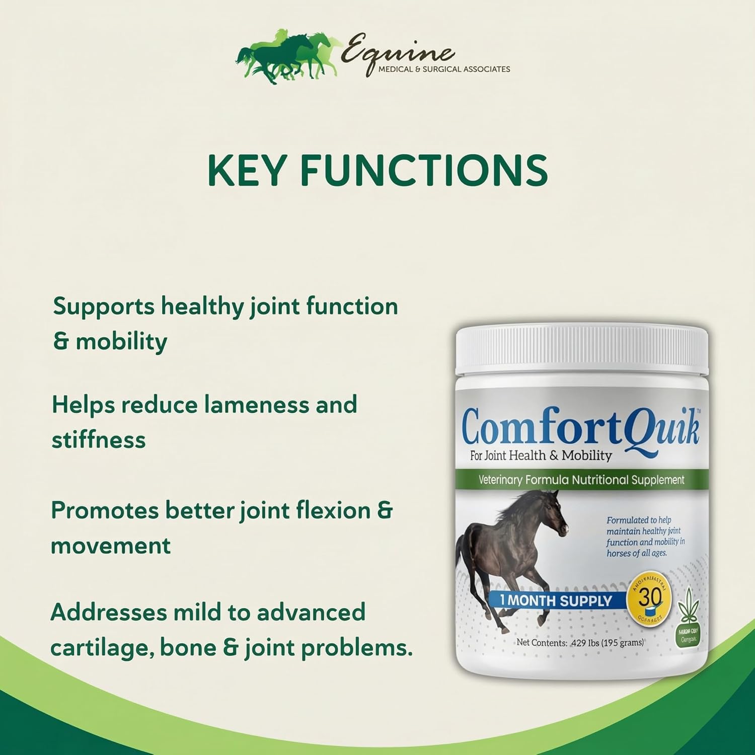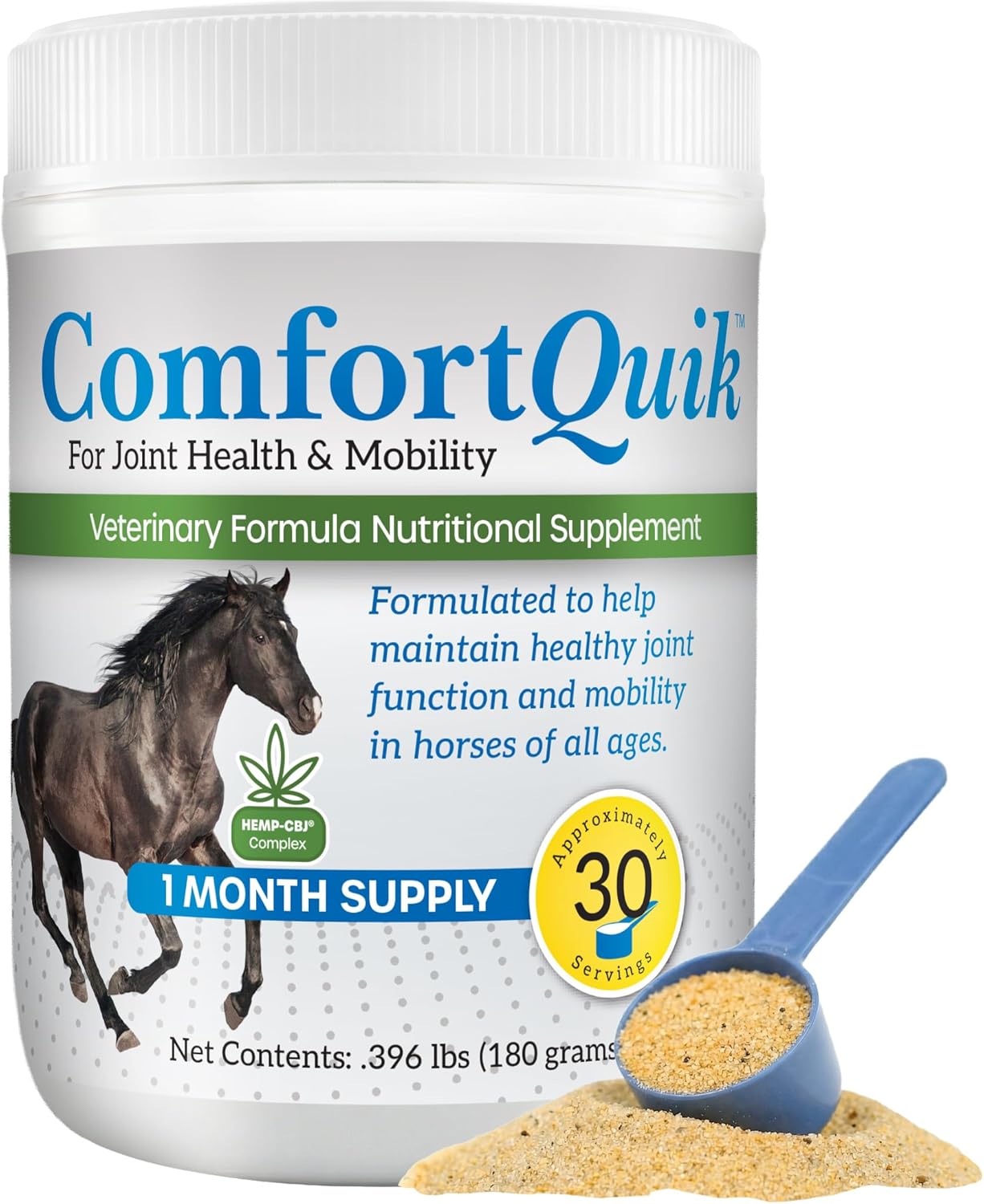 Comfort Quik with Hemp combines USDA Organic hemp seed oil and powder with botanicals, vitamins, and minerals to support joint health and mobility. Developed by an equine veterinarian for consistent daily use.
