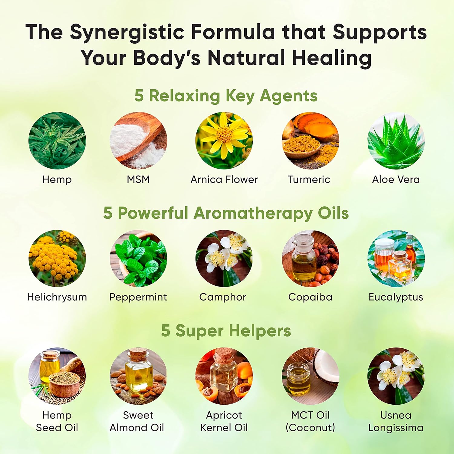 MSM, Hemp, Arnica Flower, Turmeric, Aloe Vera, Helichrysum, Peppermint, Camphor, Copaiba, Eucalyptus, Apricot Kernel Oil, Sweet Almond Oil, Hemp Seed Oil, MCT Oil (Coconut), Usnea Longissima Hemp Extract, Hemp Seed Oil, Menthol, Camphor, Arnica, Boswella, Turmeric, Lavender, Kava Kava Root, Aloe Vera Zinc Picolinate, Vitamin C, Vitamin D3, Quercetin, Curcumin, BioPerine Vitamin C & Zinc
