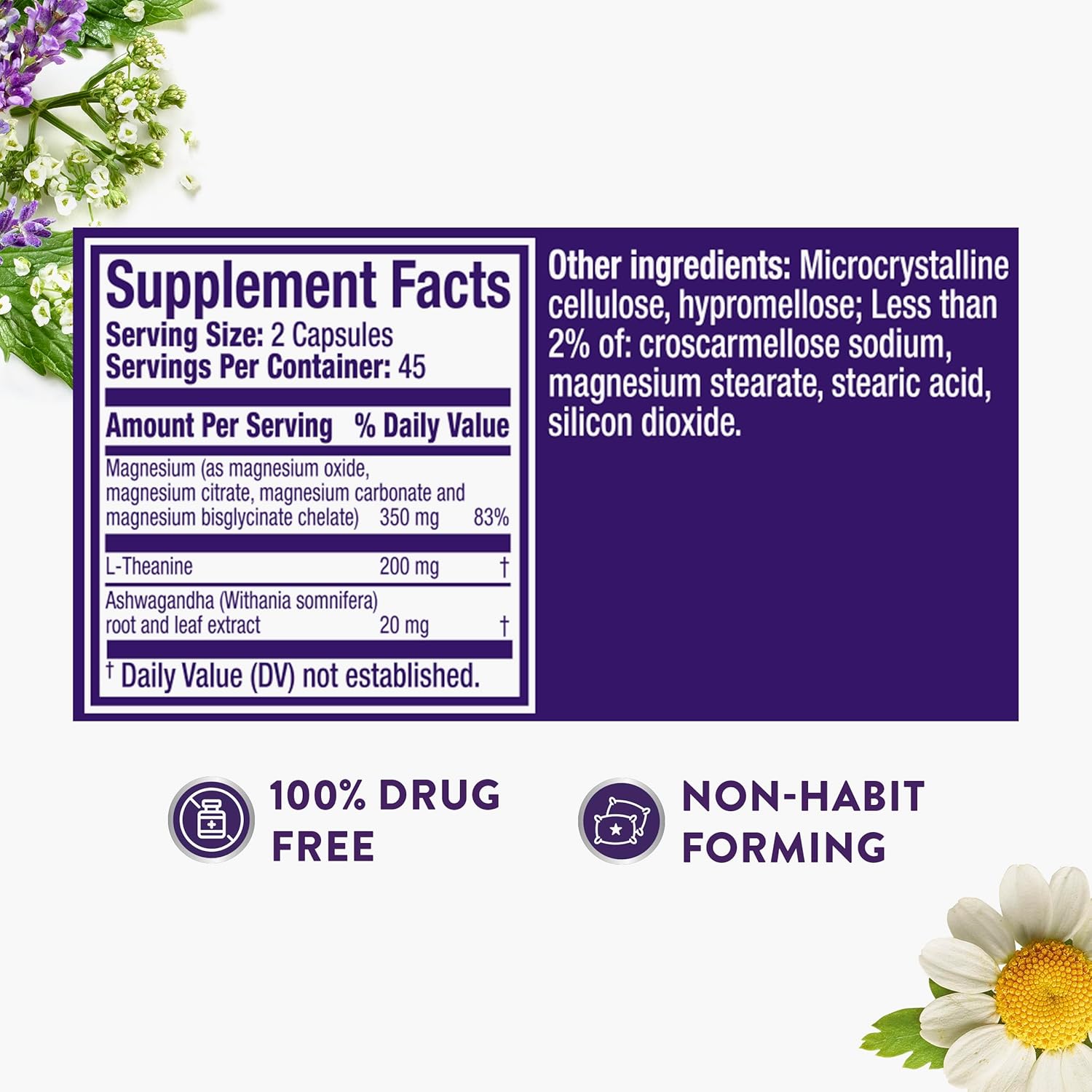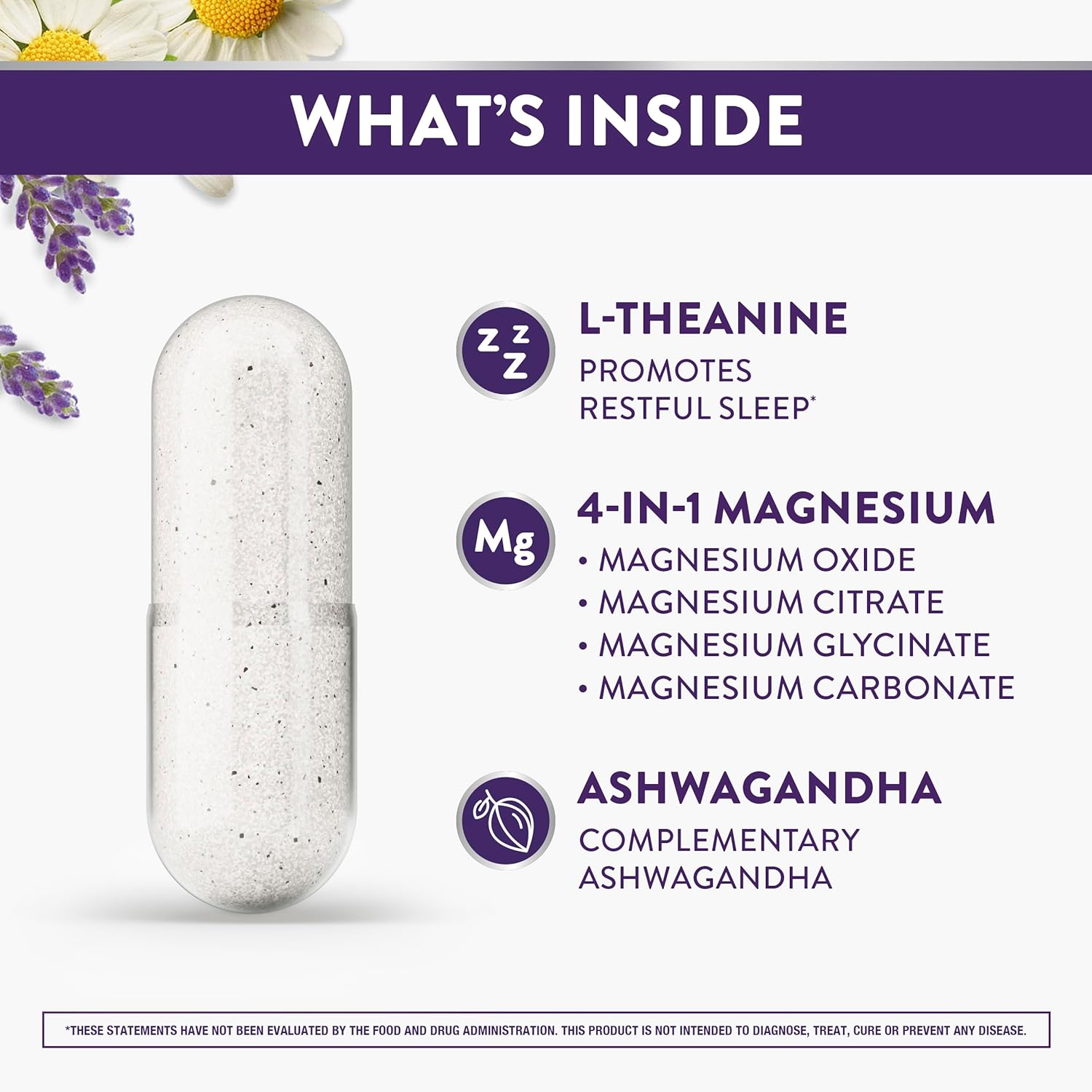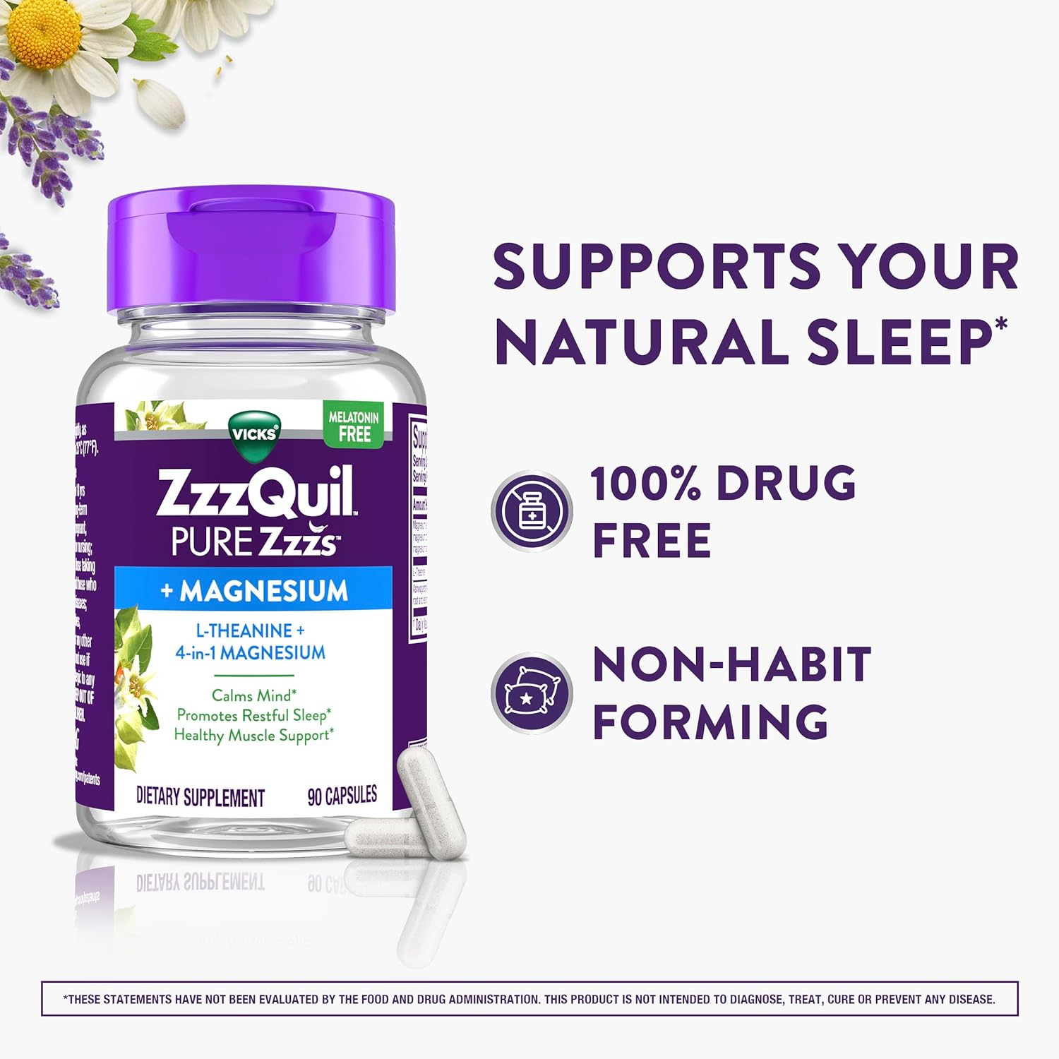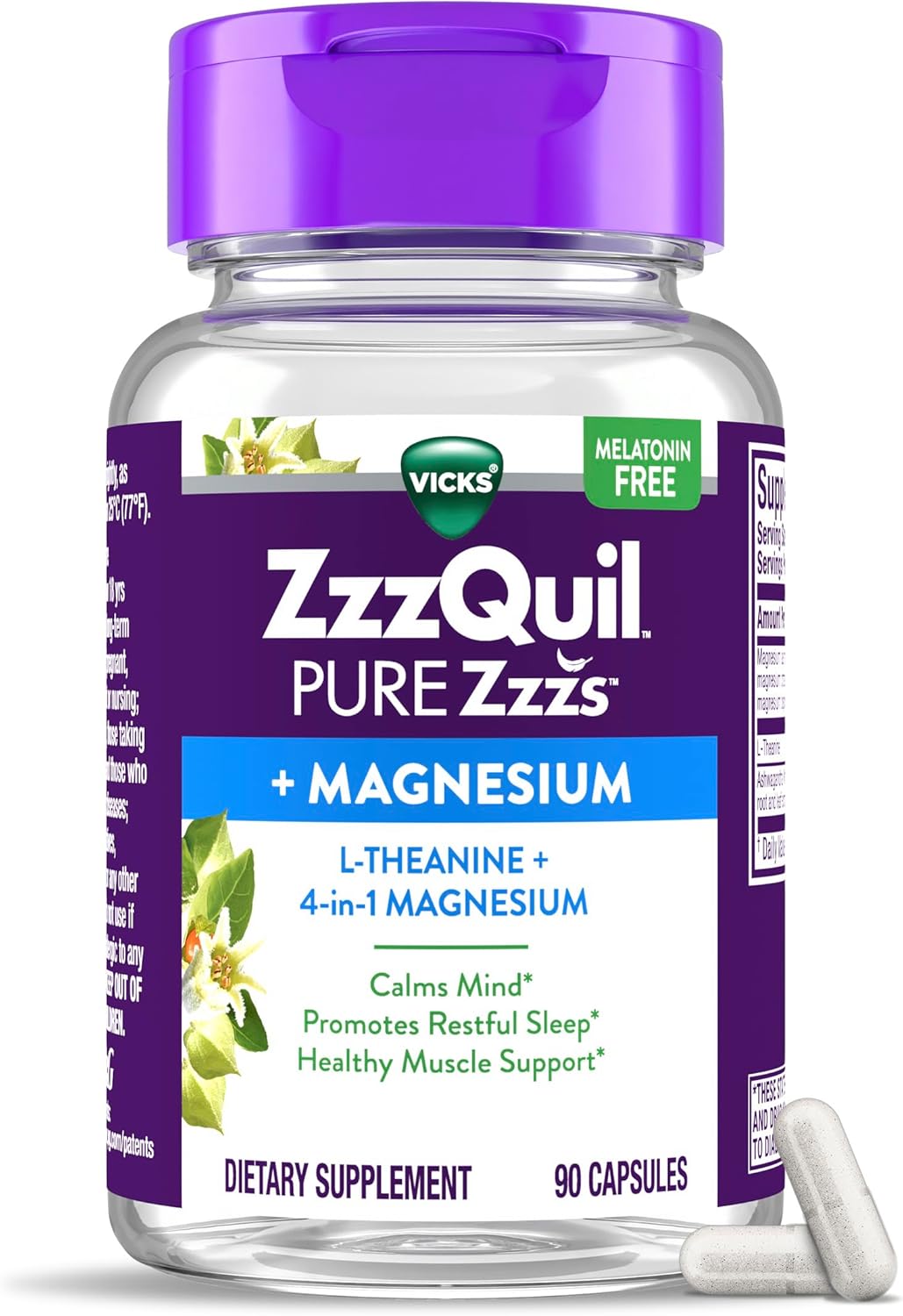 ZzzQuil PURE Zzzs +Magnesium Capsules with L-Theanine are designed to promote restful sleep and calm mind*. This dietary supplement sleep aid is formulated with L-Theanine and 4-in-1 Magnesium, including Magnesium Citrate, Magnesium Bisglycinate, Magnesium Oxide, and Magnesium Carbonate. If you have been struggling with occasional sleeplessness, you may be considering adding a sleep aid to your nighttime routine. ZzzQuil PURE Zzzs +Magnesium Capsules are made with L-Theanine, Magnesium, complementary Ashwagandha, and are a great choice to add to your nighttime routine. L-Theanine is clinically shown to promote calming brain waves, improve mood, and promote sleep wellness*. Made with 4 bioavailable forms of Magnesium, which support healthy muscle function.* *These statements have not been evaluated by the Food and Drug Administration. This product is not intended to diagnose, treat, cure, or prevent any disease. β Source Euromonitor International Limited; Consumer Health 2024 Edition; Sleep Aids, all channels, retail selling price, Global Brand Name ZzzQuil 2023 data