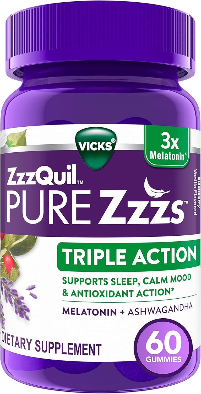 ZzzQuil PURE ZzzsTriple Action Melatonin Gummies are designed to help calm your mind and body before bed.* This dietary supplement sleep aid is formulated with 3x the melatonin (melatonin 6mg per serving, melatonin 3mg per gummy) compared to ZzzQuil PURE Zzzs to boost antioxidant action.* This melatonin and ashwagandha sleep aid works naturally with your body to support your body’s natural sleep cycle and soothe the consequences of occasional stress like sleeplessness, irritability, inability to concentrate*. They contain Ashwagandha, an adaptogenic herb to help you deal with occasional stress.* Ashwagadnha has been used for centuries in traditional Ayurvedic medicine. If you’ve been having occasional sleeplessness , whether it’s caused by stress, changes in your schedule, or just restless thoughts, you may be considering adding a melatonin sleep aid to your nighttime routine as a solution. ZzzQuil PURE Zzzs Triple Action Melatonin gummies are a great choice when you are dealing with occasional sleeplessness because they are drug-free and non-habit forming. This ZzzQuil PURE Zzzs melatonin sleep aid works naturally with your body to support sleep and is specially formulated with 6mg melatonin and ashwagandha. They also include a complementary blend of botanicals including chamomile, lavender, lemon balm, and valerian root. ZzzQuil PURE Zzzs was developed by the trusted experts at Vicks, because everyone deserves a great night’s sleep. ZzzQuil is the World’s #1 Sleep Aid Brand!† *These statements have not been evaluated by the Food and Drug Administration. This product is not intended to diagnose, treat, cure, or prevent any disease. †Source Euromonitor International Limited; Consumer Health 2024 Edition; Sleep Aids, all channels, retail selling price, Global Brand Name ZzzQuil 2023 data