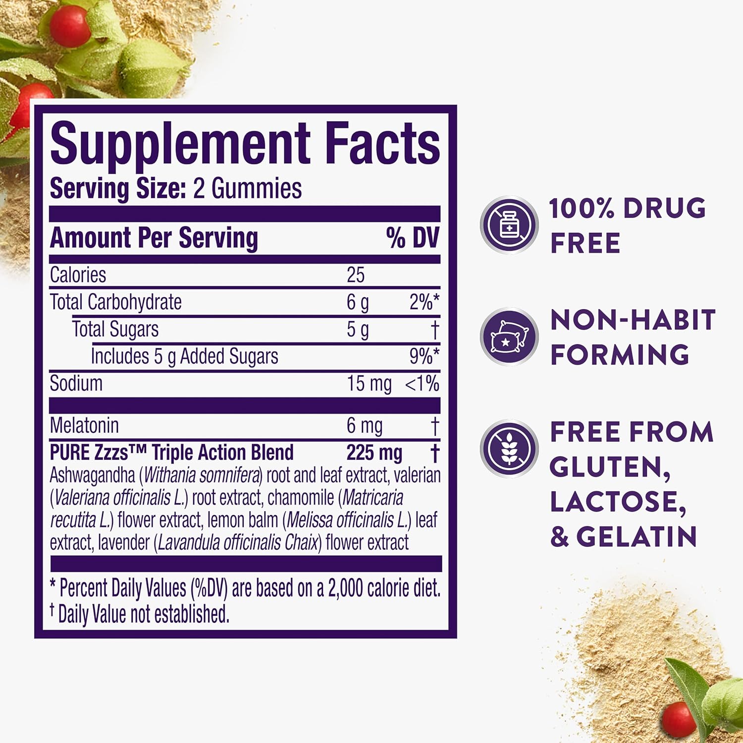FALL ASLEEP FAST*, STAY ASLEEP LONGER*: ZzzQuil PURE Zzzs Triple Action melatonin gummies have 6mg Melatonin and ashwagandha per serving . Melatonin helps you fall asleep fast* and stay asleep longer.*